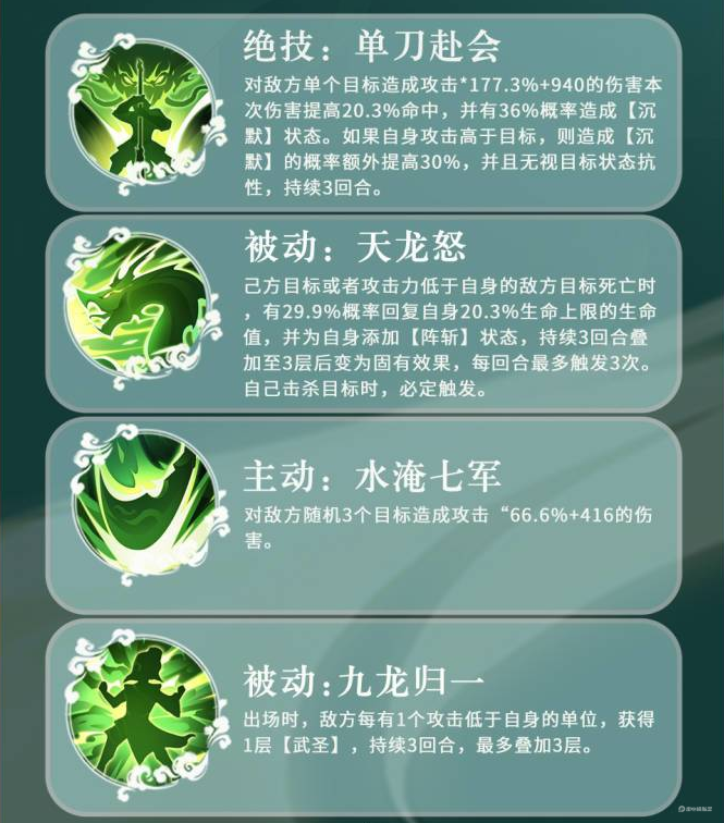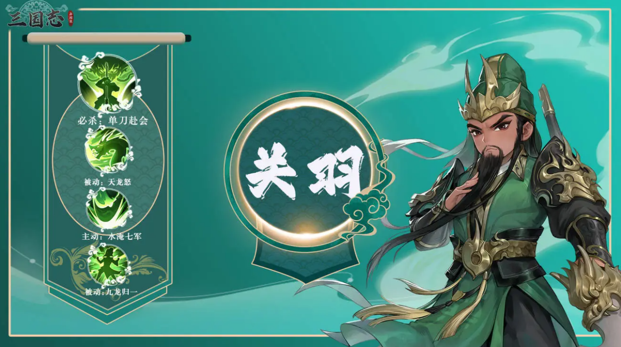 关羽的绝技单刀赴会针对单体爆发极强,不仅能打出高额伤害、提升命中,还拥有稳定的沉默控制;自身攻击高于目标时,沉默概率大幅提升且无视抗性,压制力拉满。主动技能水淹七军可对敌方随机3名目标造成范围伤害,配合被动能在团战中持续输出、稳定压血。