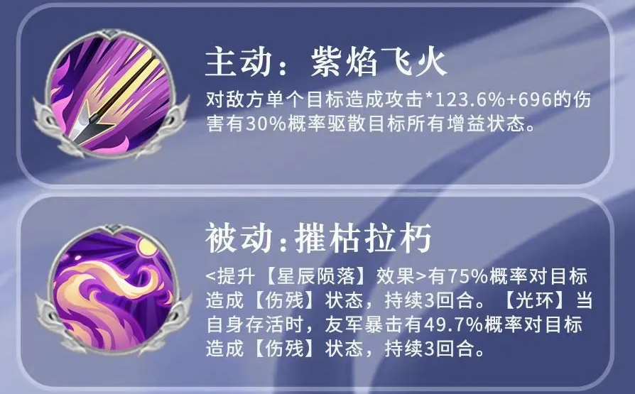 被动技能“破甲如风”是核心,触发暴击时会减目标2点怒气,还能降低对方防御,百分百触发伤残状态;攻击敏捷比自己低的敌人时,暴击概率还能提33%,输出和控场能力直接拉满。主动技能“紫焰飞火”能打出范围伤害,配合暴击能叠加控制效果,必杀技“星辰陨落”则能打出高额单体伤害,完美契合他速战速决的作战风格。