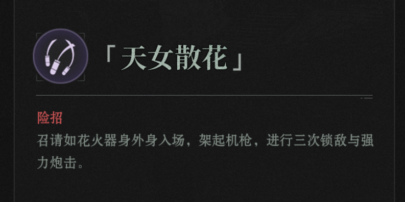 该技能属于三个体力消耗的身外身,一般这类消耗的身外身都是大招待遇,天女散花的效果是可以召唤一个火如花,火箭炮三次索敌造成伤害,该技能敌人一般无法躲避,时机把握得当可以造成海量的伤害,是很多输出不够的角色都会携带的一个补充伤害的技能。
