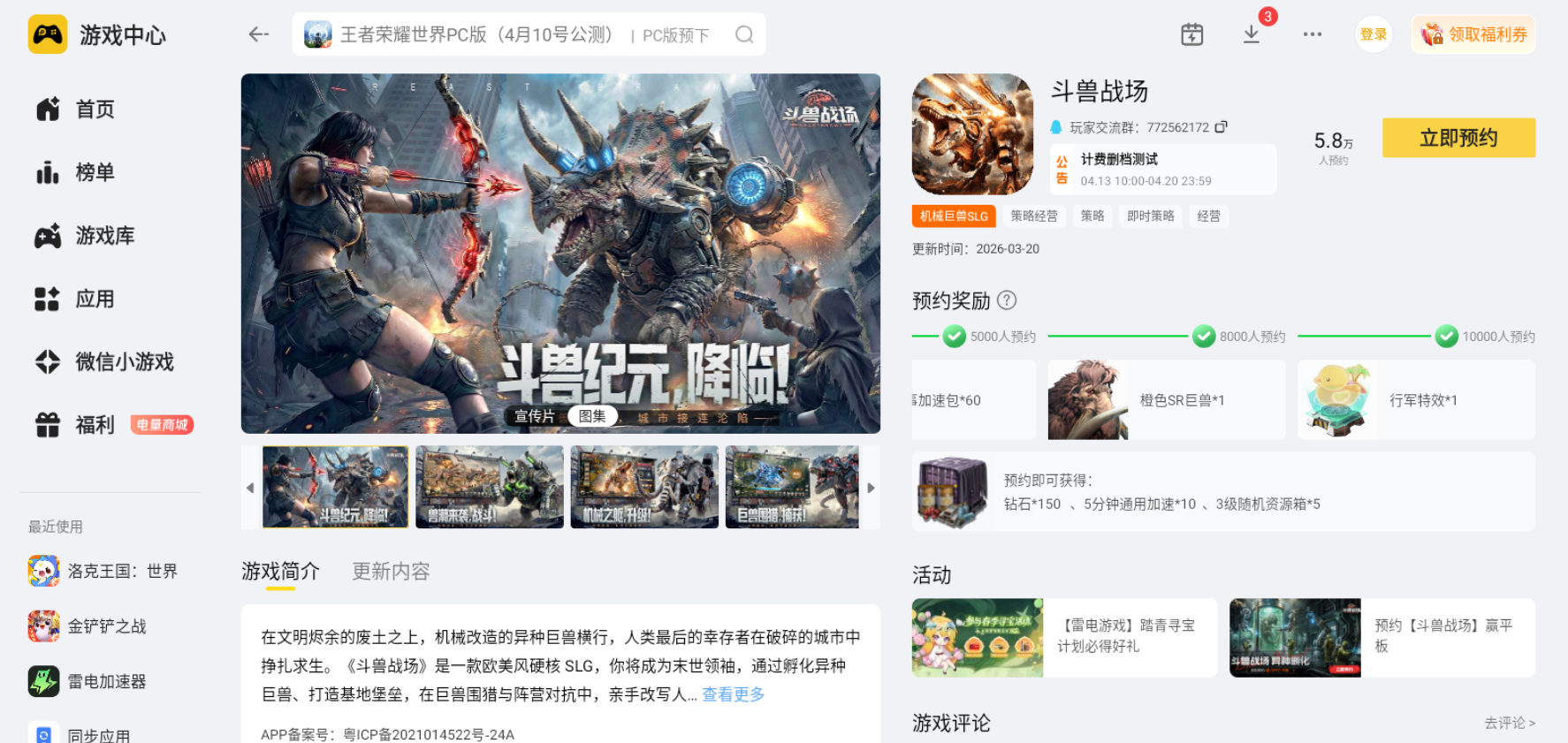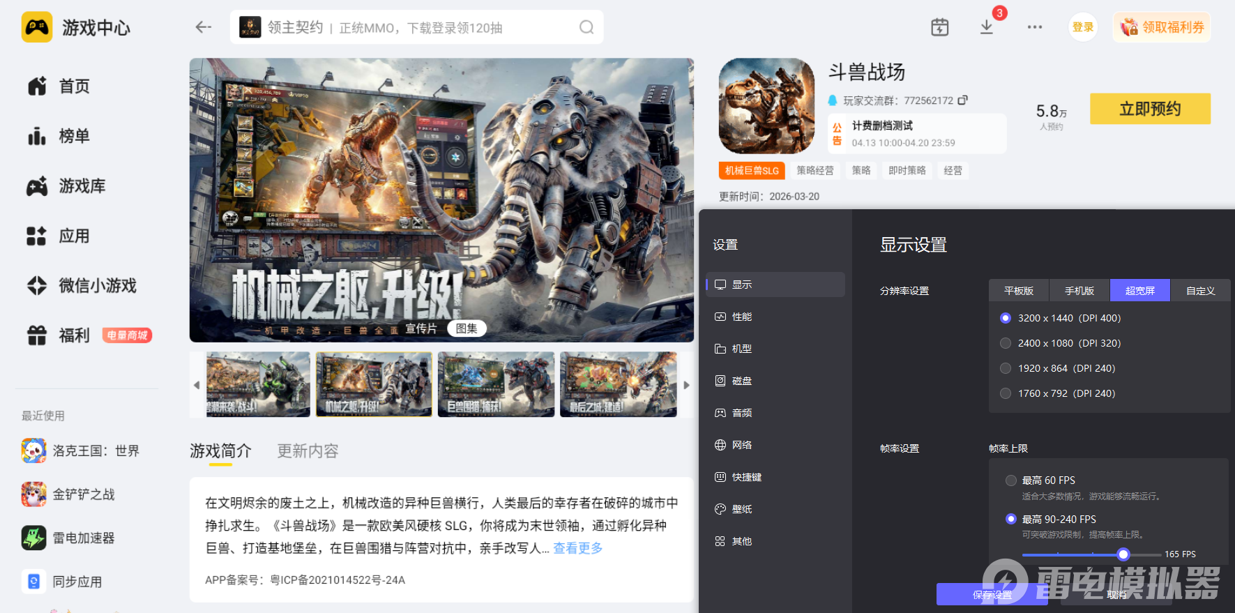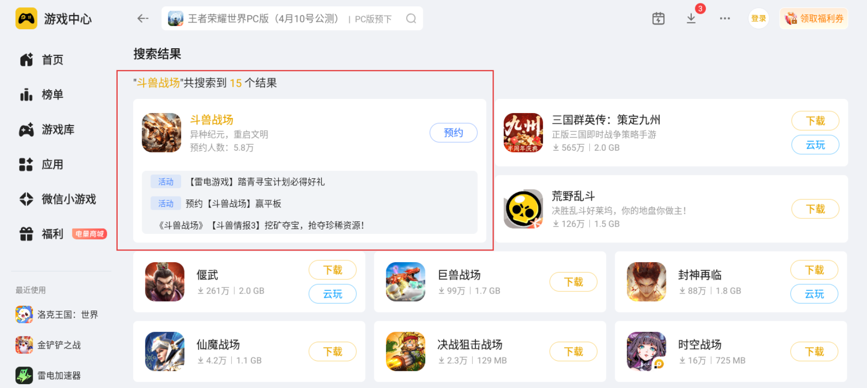 想要在电脑端畅玩斗兽战场,小编建议大家首选雷电模拟器,该模拟器对这款手游的适配性拉满,是游玩该游戏的理想选择。仅需前往雷电模拟器官网,在官网首页找到对应的下载入口,下载安装结束后,在模拟器内的雷电游戏中心搜索斗兽战场并完成预约,游戏上线时就能快速开启电脑端的游戏之旅。