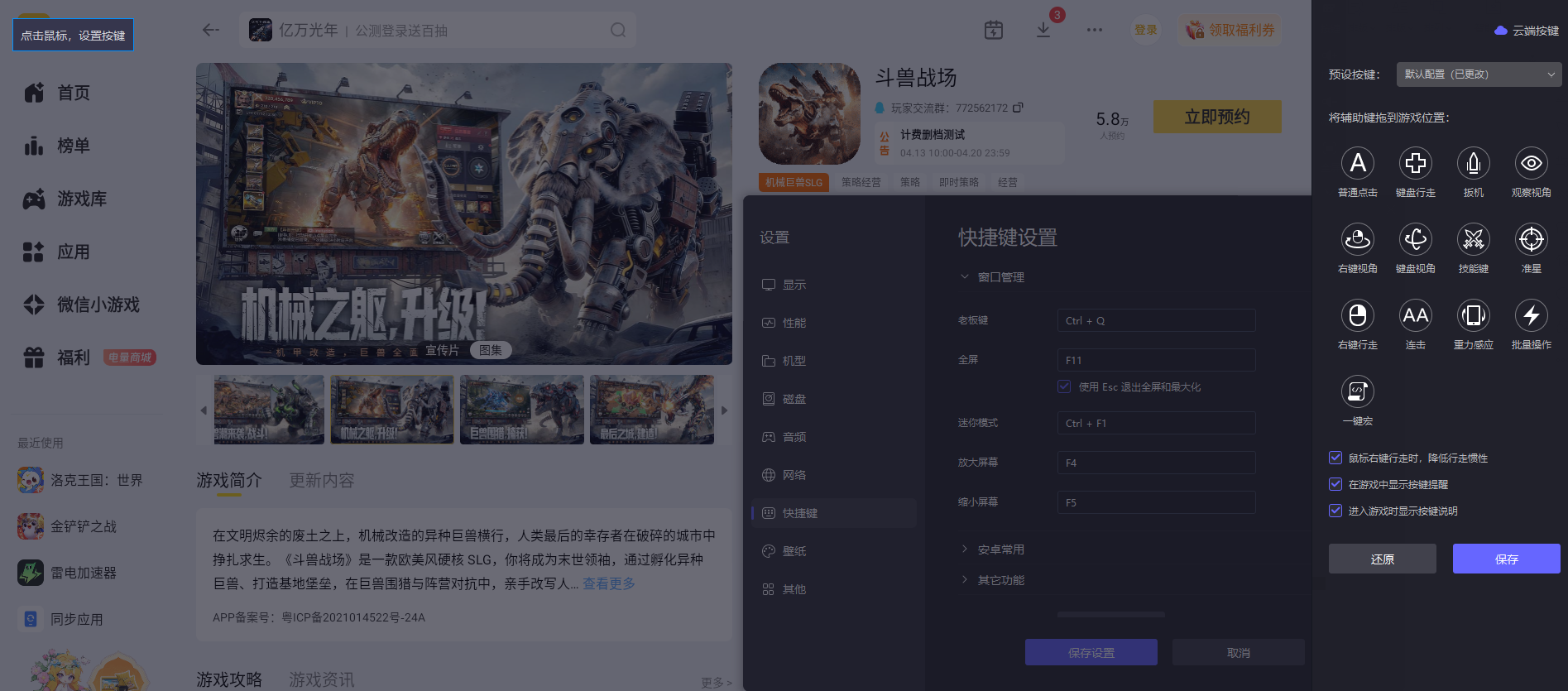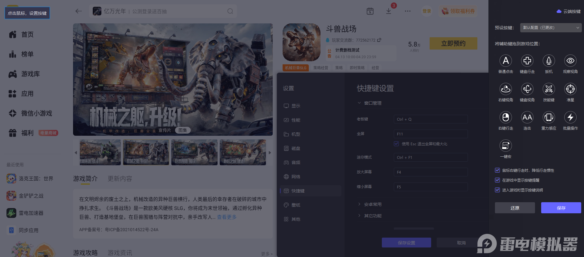 游戏核心玩法离不开即时操作,无论是巨兽技能释放、战场走位调整,还是基地建设、巨兽养成的快捷操作,雷电模拟器支持键盘鼠标自定义按键设置,玩家可根据游戏玩法习惯专属设定操控按键,让每一项操作都更贴合需求,技能释放、阵容调配等操作都能精准完成,大幅提升操作的便捷性与流畅度。