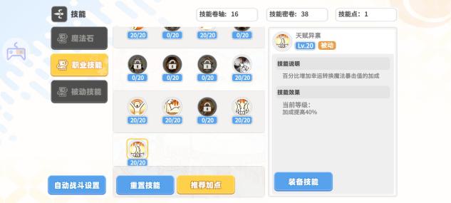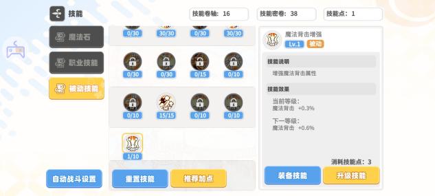 加点如图富裕技能点点被动技能,技能点富裕后补满魔法背击增强、最大攻击增强、最小攻击增强以及魔法暴击增强
