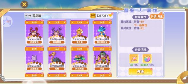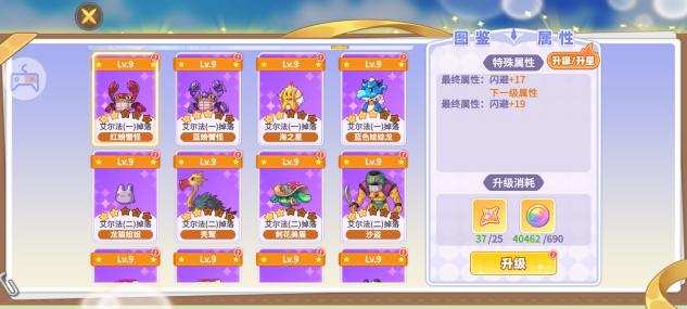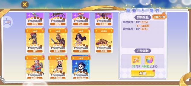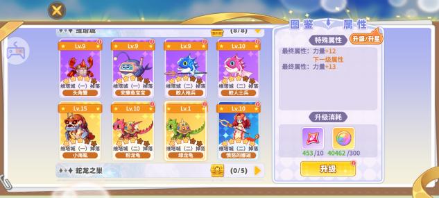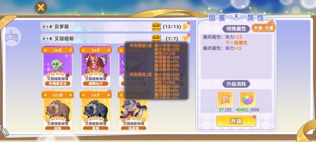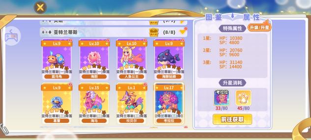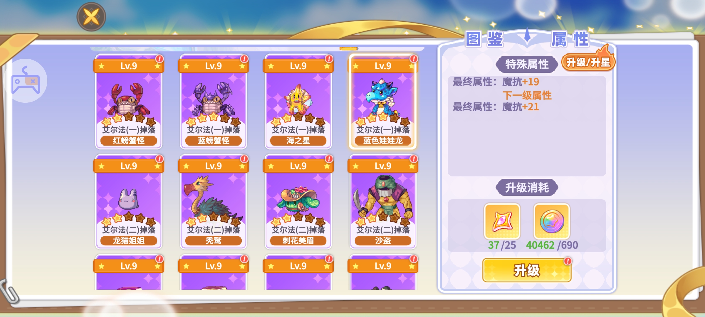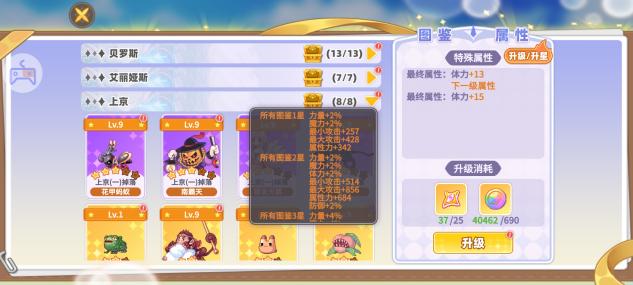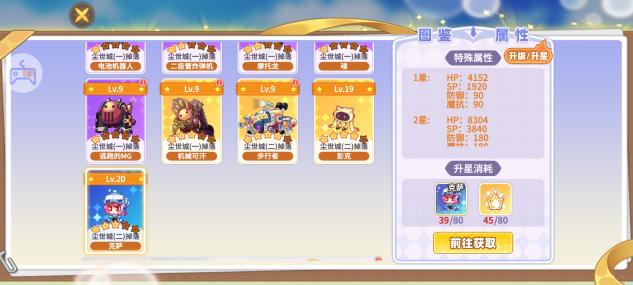 每种图鉴的星级分别提升为:1.(HP、SP);2.(HP、SP、防御、魔抗);3.(最大攻击、最小攻击、属性力)。(如下图举例)