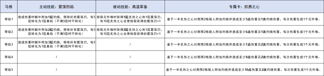 - 关键词「炙热之心」:回合开始时,对周围2格生物触发1次其自身灼烧层数的伤害效果。