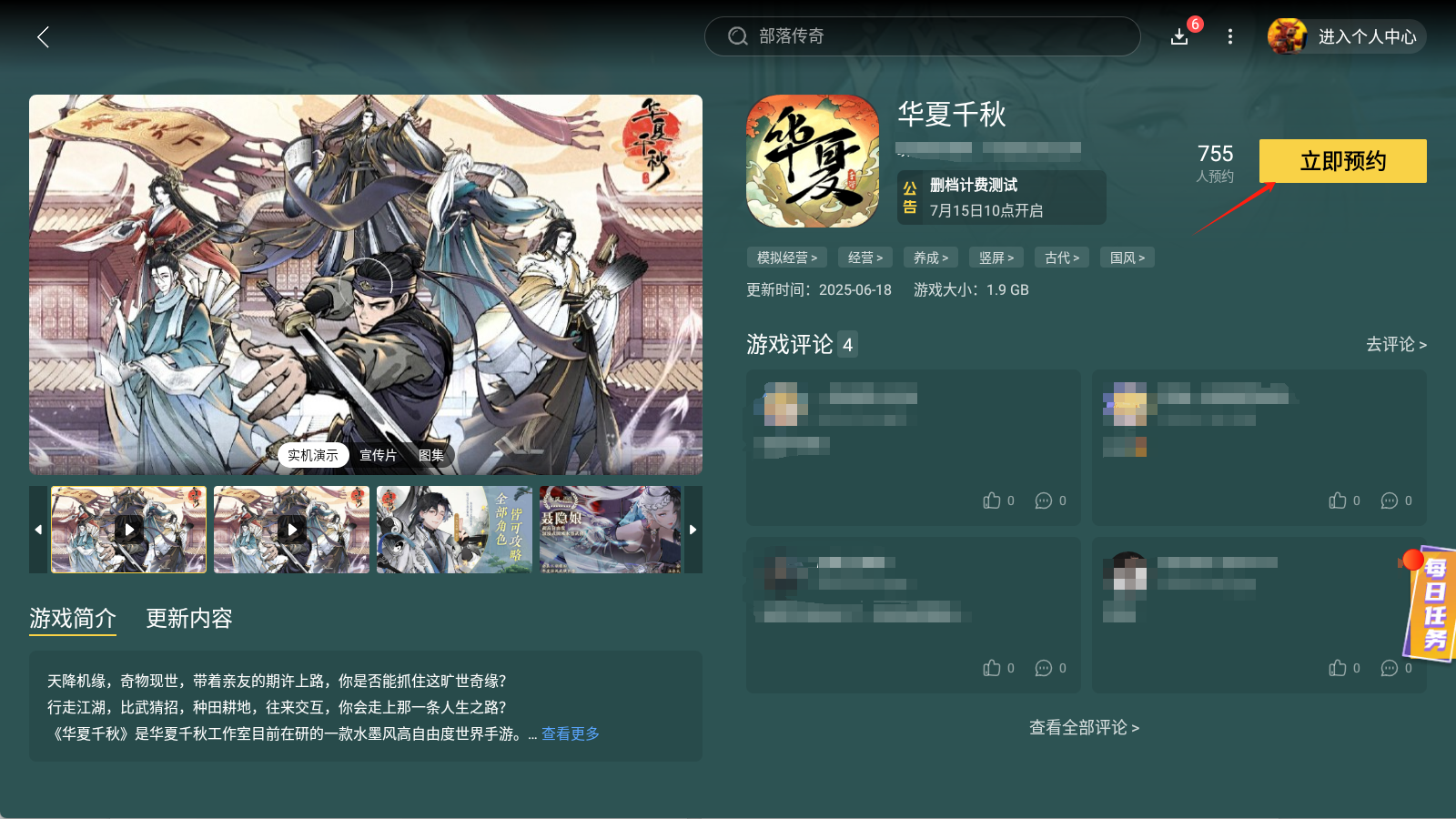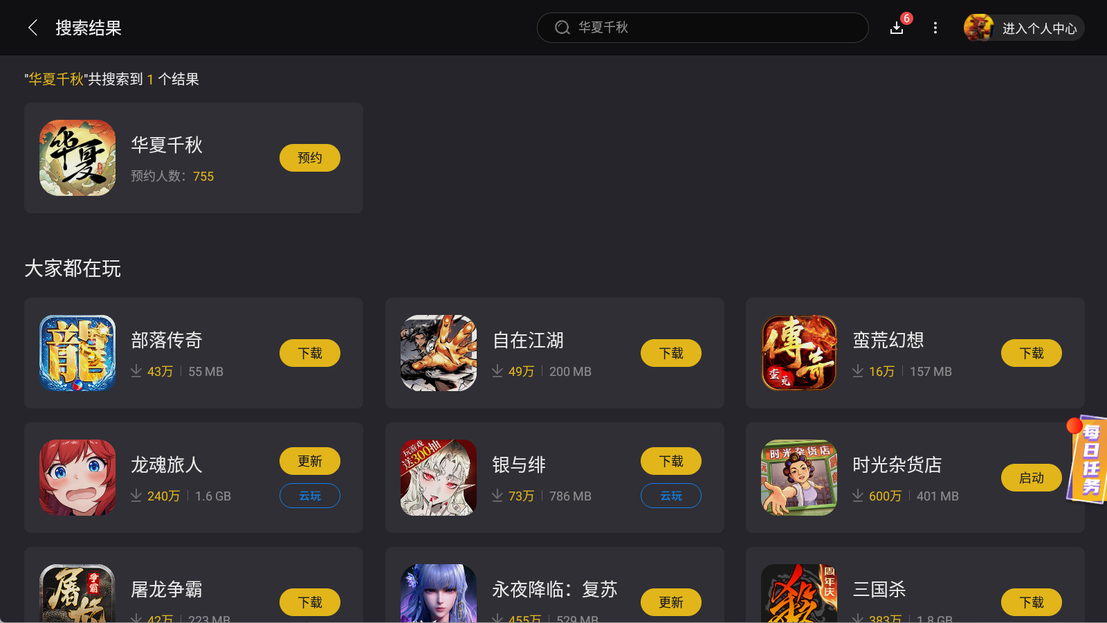 启动后,进入雷电游戏中心。在游戏中心的搜索栏中输入“华夏千秋”