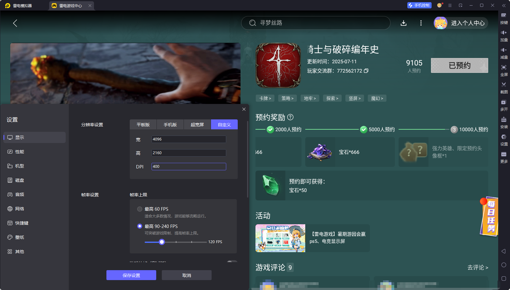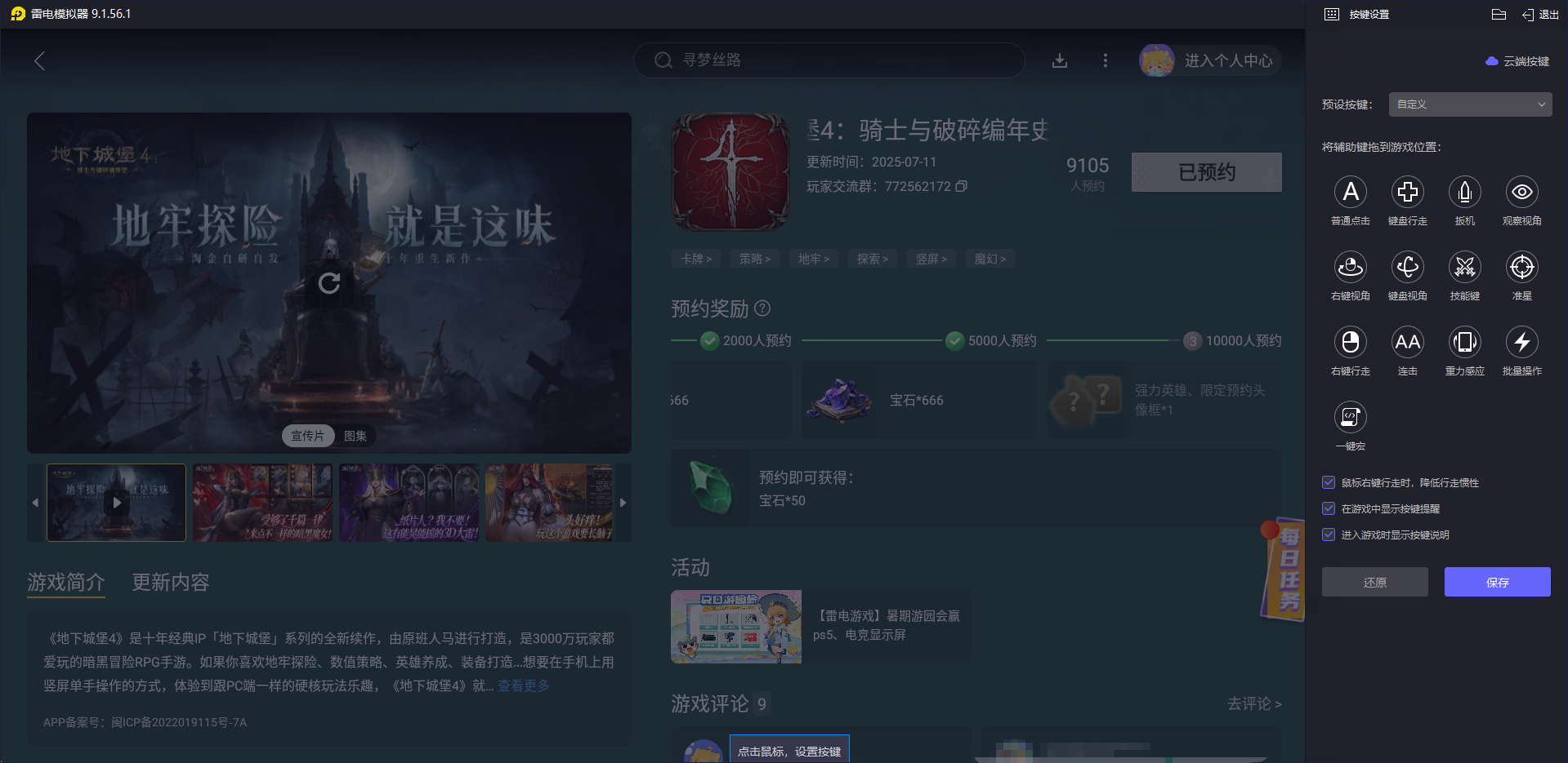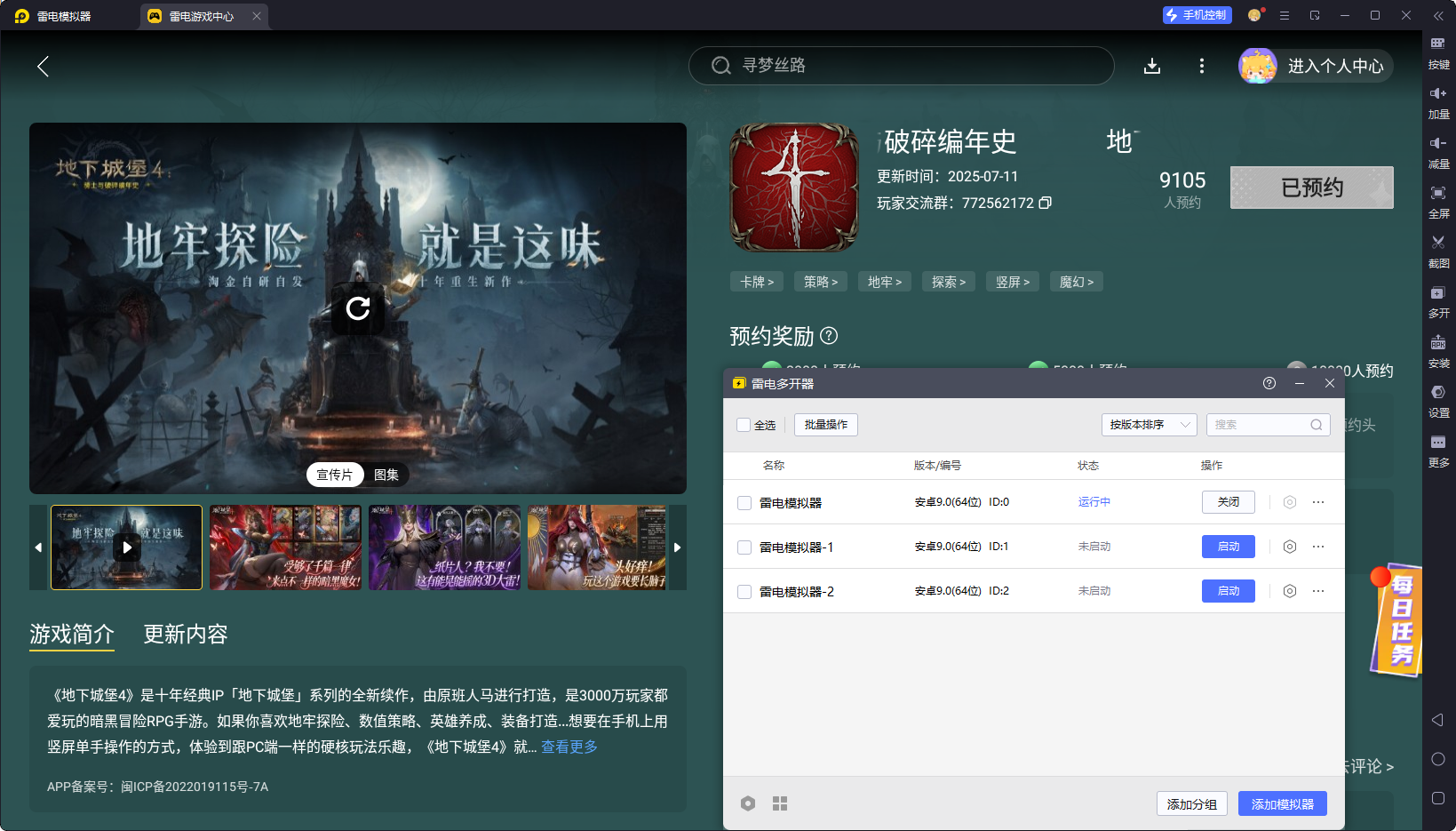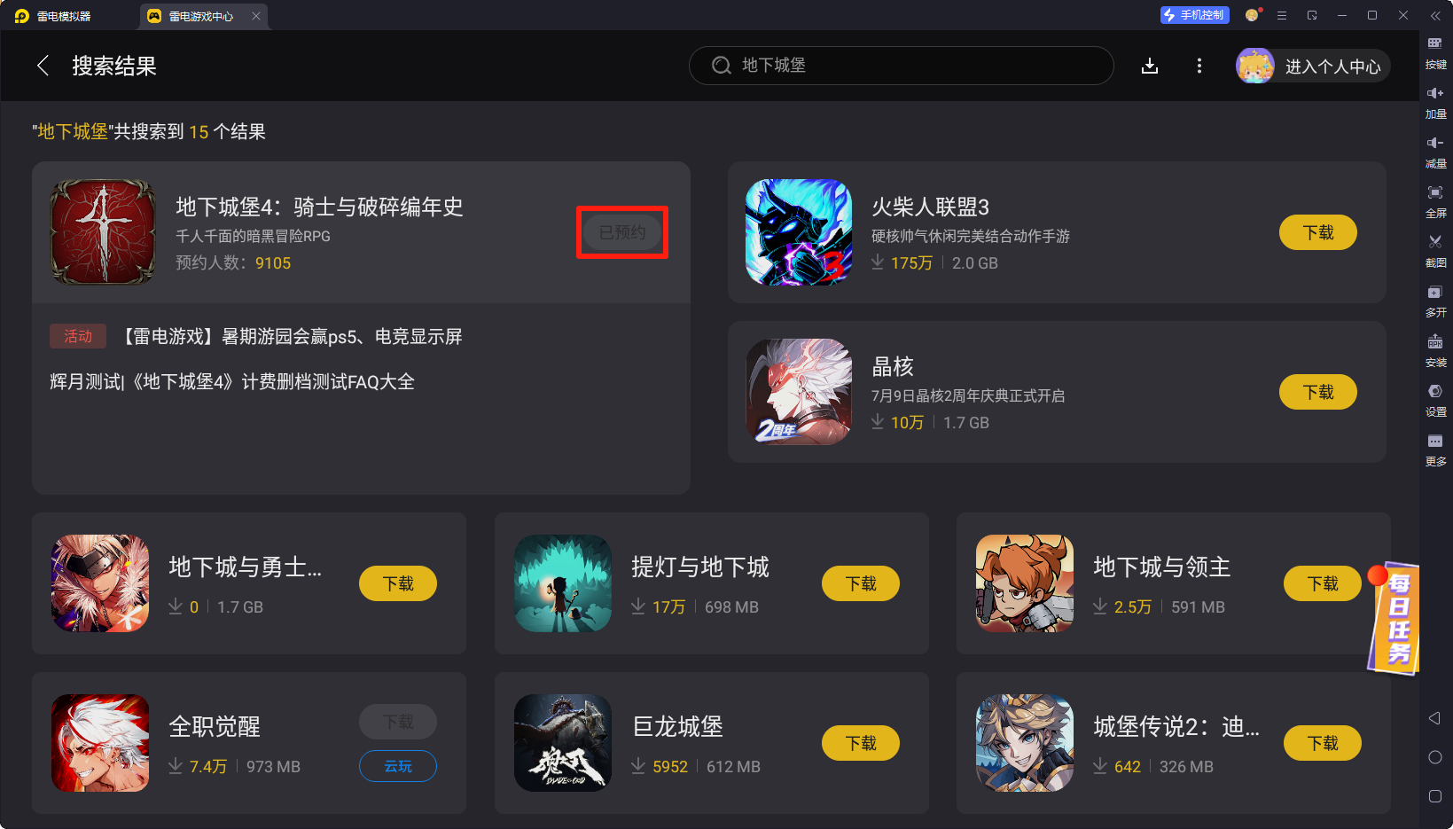 启动雷电模拟器后,进入内置的“雷电游戏中心”,搜索“地下城堡4:骑士与破碎编年史”,点击“预约”按钮。待游戏上线后,系统将自动完成安装。