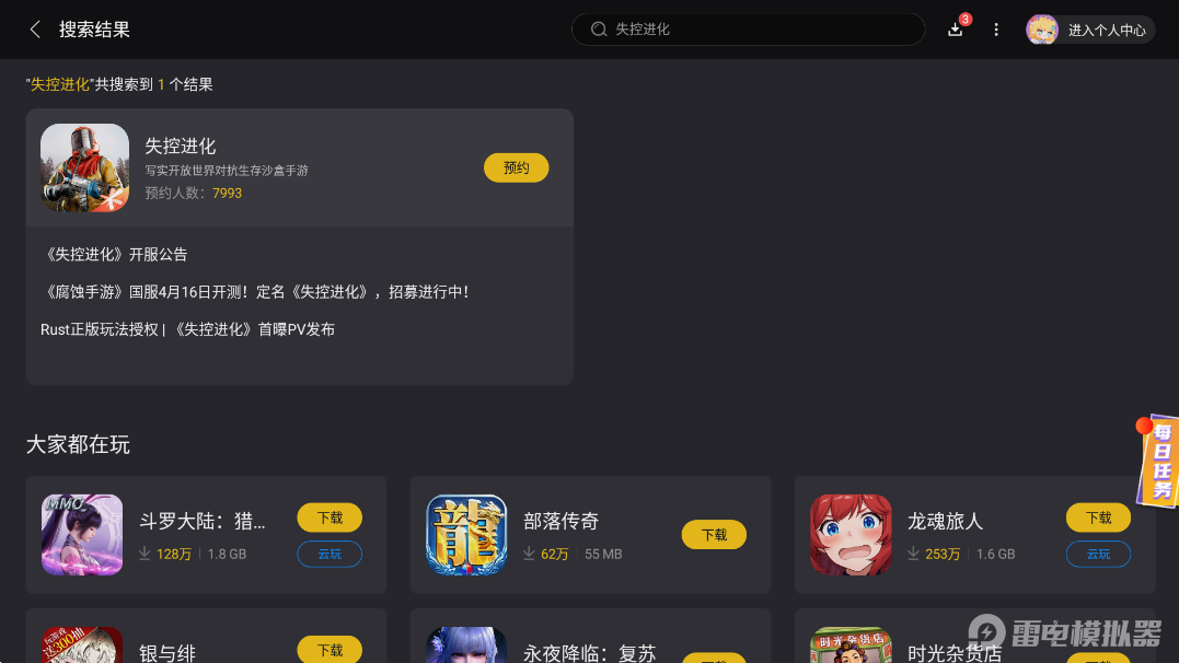 其实对于广大小伙伴们而言,想要通过模拟器体验此类作品,那么雷电模拟器就很合适,不仅支持对其进行预约,并且大屏带来的体验也是手机所无法比拟的,关键是雷电模拟器支持高达240帧的高刷新率,远超手机性能限制,对于《失控进化》这种需要快速反应的生存对抗游戏十分的重要,尤其在移动、射击等场景中,能进一步提升玩家操作精度。
