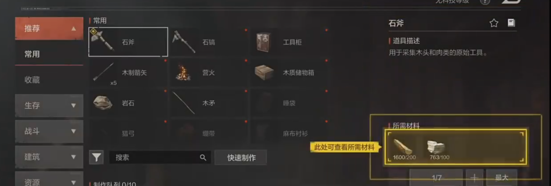 制作基础工具是石头的首要价值。跟木头一起可以合成石斧和石镐,如果没有石斧和石镐,玩家会长期陷入徒手采集的低效困境。