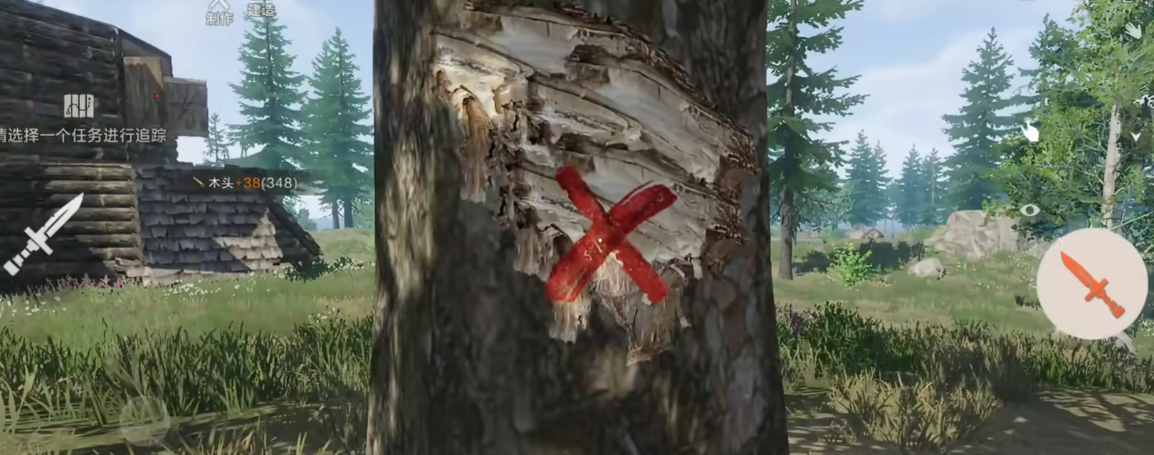 操作靠虚拟摇杆移动,右侧有固定的攻击、跳跃、背包按钮,双击屏幕空白处可快速奔跑,滑动屏幕能转动视角。靠近物体时点交互按钮就能采集、开门、用工作台等,长按还能连续采集树木和矿石,优先攻击标红X的节点能提高效率。