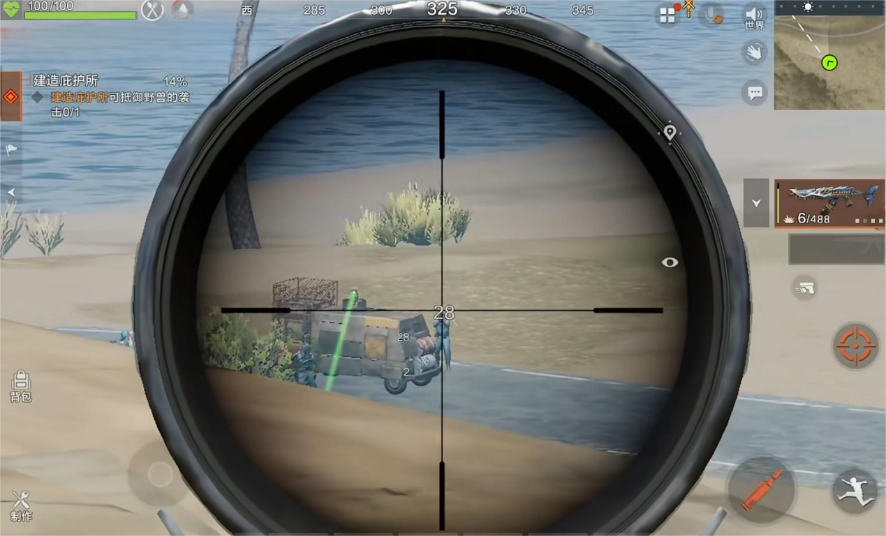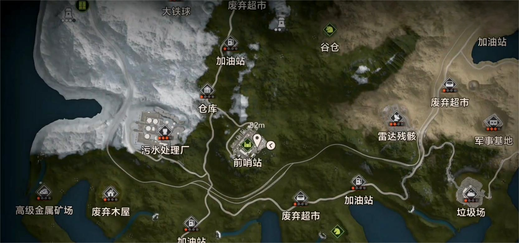 屏幕下方的状态栏会显示生命值、口渴值、饱腹值,得靠食物、淡水和休息来维持,生命值低于30%时切换近战武器能触发“生命偷取”被动回血;通过底部按钮快速切换主副武器;点地图按钮能看全局,绿色区域是安全区,能买物资但得把威胁值清零发现隐藏入口后可以做标记,方便之后再来探索。