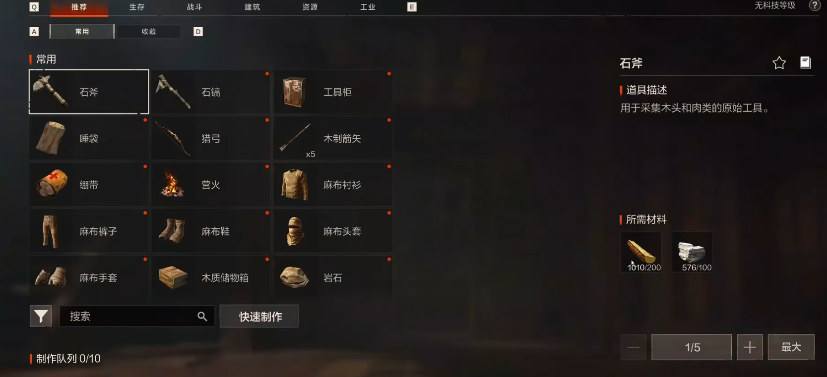 初期用拳头或石斧敲树木、石镐挖矿石,做好熔炉后就能冶炼金属锭,用来升级装备和建筑;砍亚麻或分解物品能拿到纤维,可用来做睡袋和绷带,铁桶、物资箱里能收集废料,这是安全区的交易货币。