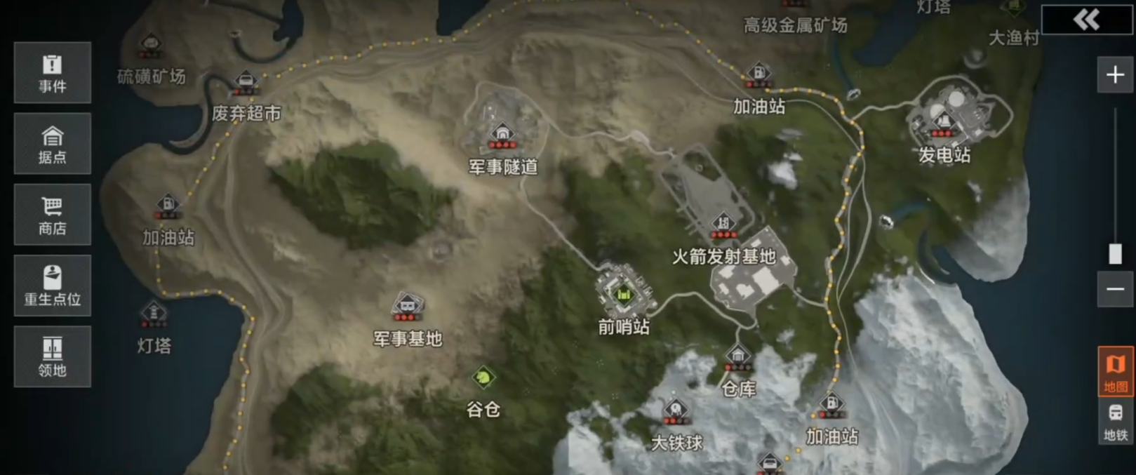 一级资源点包括加油站、超市等,会刷新基础物资和用冷兵器的敌人,全图共20个,适合前期发育;