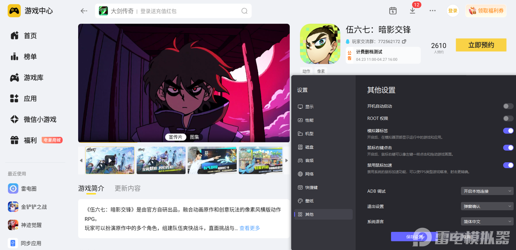 伍六七暗影交锋主打像素风格横版动作对战,还搭配特色店铺经营养成玩法,游戏里需要频繁切换角色释放连招、精准触发格挡闪避操作,日常经营打理也需要细致查看各类资源数值。这时候选择雷电模拟器运行这款手游,就能完美适配游戏全部运行需求,适配游戏所有角色技能和经营系统,全程贴合游戏原生设定运行。