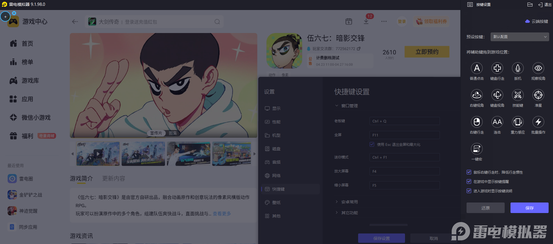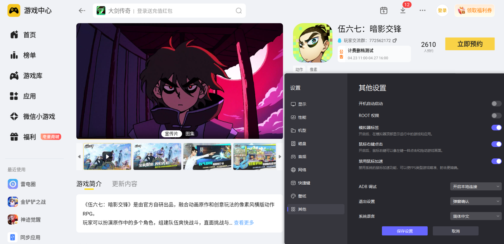 伍六七暗影交锋主打横版格斗闯关和模拟经营两大核心玩法,游戏里可以操控伍六七、梅花十三等经典角色打出流畅技能连招,还能经营特色小店积累养成资源。想要完整体验游戏所有内容,感受连招对战的爽感和经营玩法的细节内容,在电脑上用雷电模拟器来玩这款手游就特别合适,电脑大屏搭配专业适配设置,能完美贴合游戏各类玩法运行需求。大家要在官网下载雷电模拟器,然后在雷电游戏中心搜索该游戏,点击预约就可以啦。
