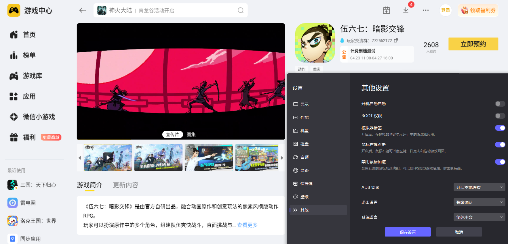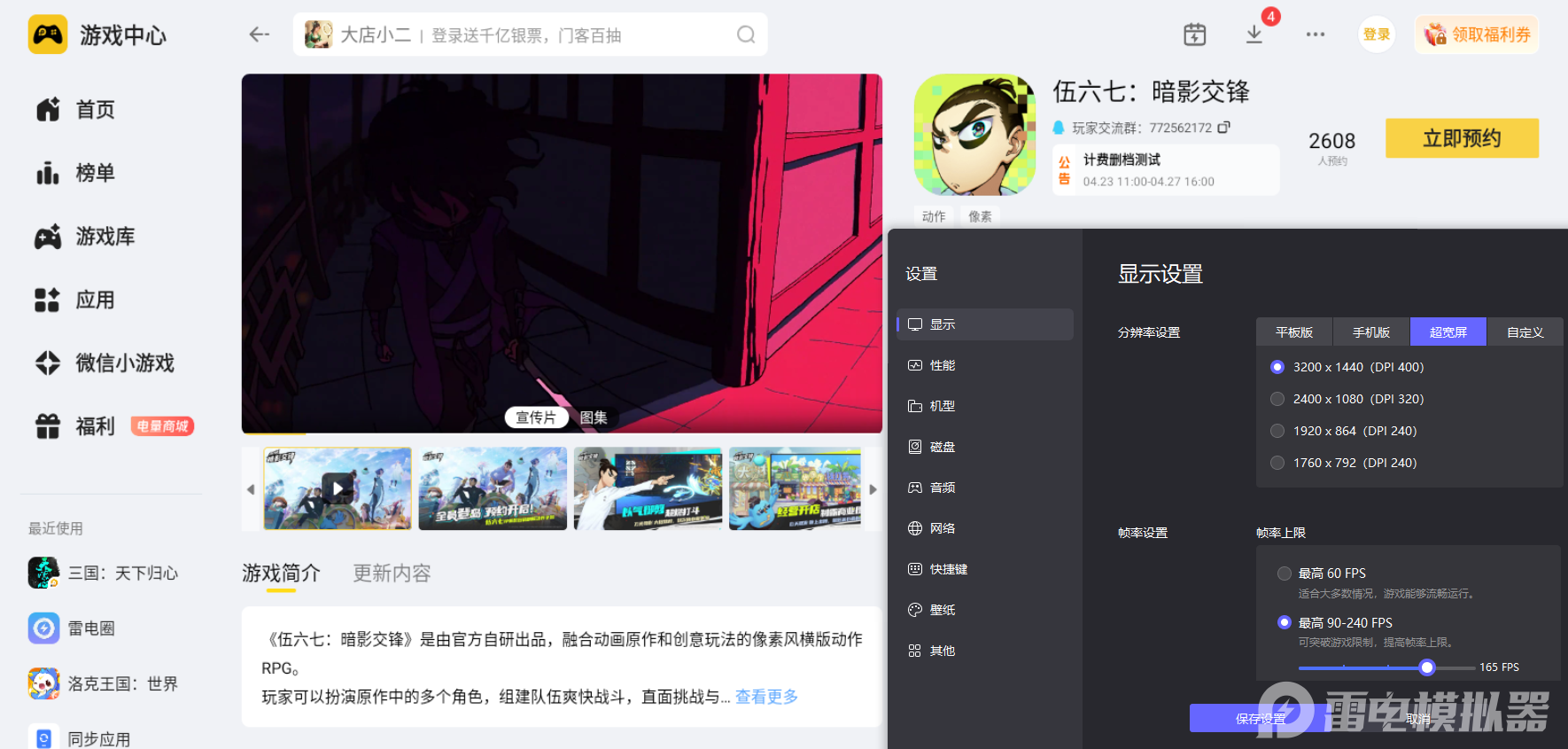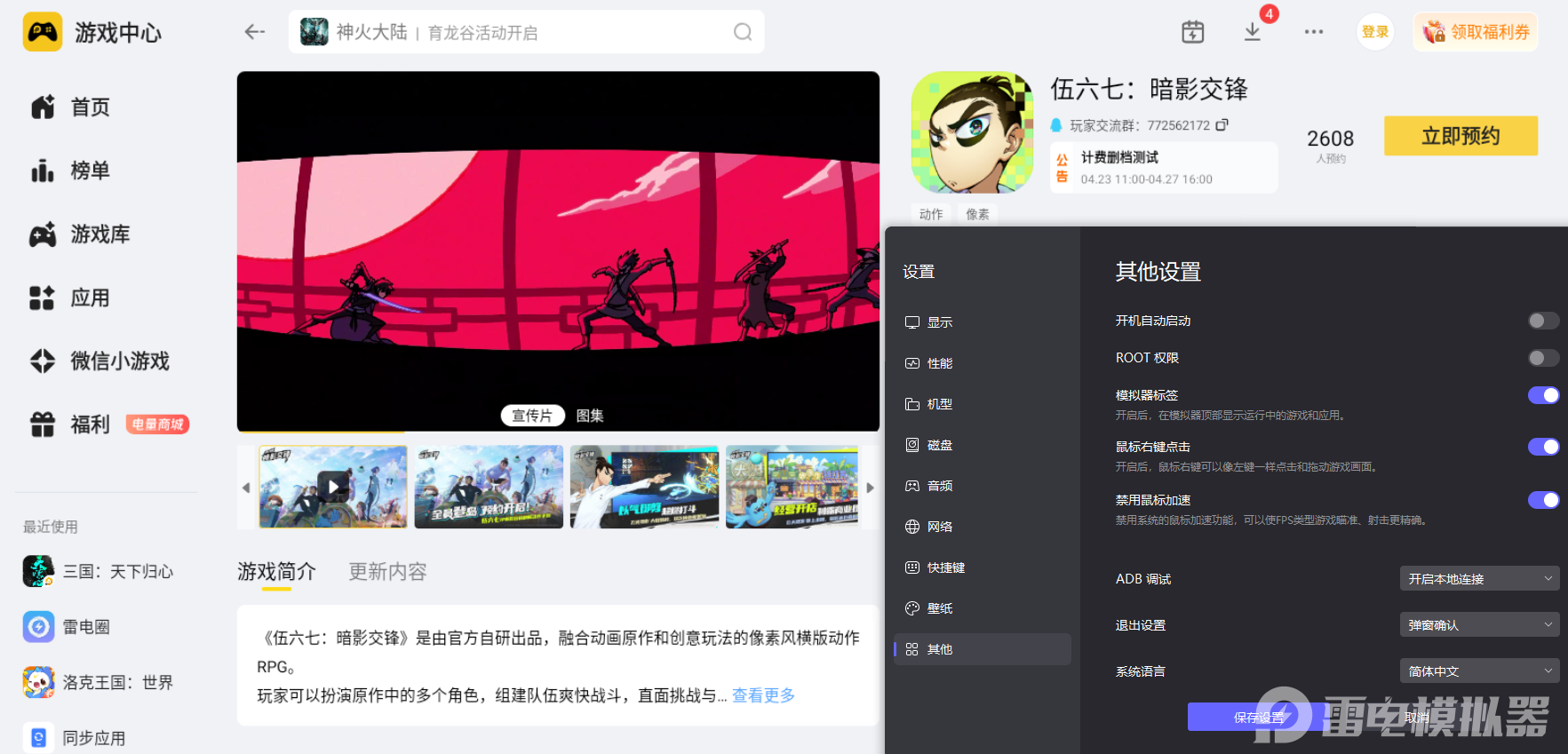 伍六七暗影交锋主打横版热血动作战斗搭配休闲店铺经营双线核心玩法,既能操控经典动画角色释放连招闯关对战各类强敌,也能打理专属发廊积累养成资源解锁角色潜能。贴合这款游戏双重游玩节奏的特点,小编觉得在电脑上用雷电模拟器运行这个游戏,能彻底适配游戏各类操作节奏和游玩场景,带来远超移动端的基础游玩体验。大家只需要在官网下载雷电模拟器,然后再雷电游戏中心搜索“伍六七暗影交锋”,点击预约即可。