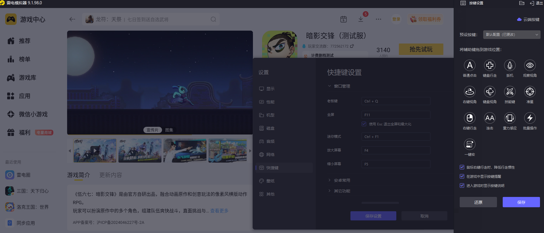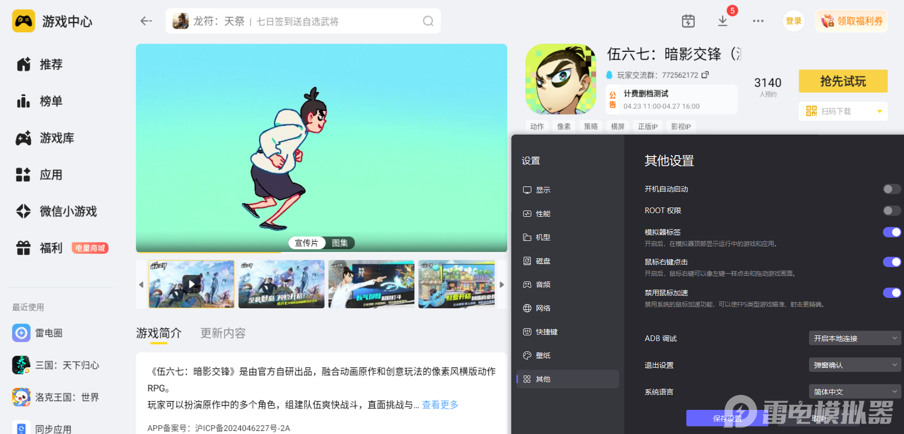 首先打开雷电模拟器官网,下载正版安装包并完成程序安装。启动模拟器后,在内置的雷电游戏中心搜索“伍六七暗影交锋”,然后点击下载即可。由于游戏目前处于测试阶段,大家要赶紧下载游戏,才可以抢到游戏体验资格,而且用雷电模拟器玩还可以获得更好的游戏体验。
