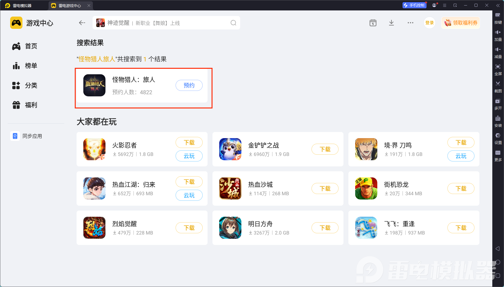结合游戏的狩猎和操作需求,最适合的电脑版运行工具就是雷电模拟器。它能完美适配游戏的战斗和探索玩法,下载方式也很简单:首先打开浏览器搜索“雷电模拟器官网”,然后下载安装。安装完成后打开模拟器,在内置的雷电游戏中心搜索“怪物猎人旅人”,点击预约按钮,游戏上线的时候模拟器会自动完成安装,之后点击游戏图标就能启动游玩。