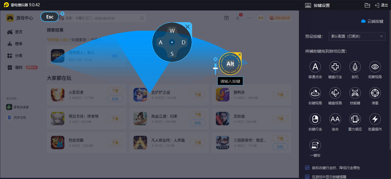 其实不论是使用什么样的武器,战斗时的效率以及精准度都是很重要的,雷电模拟器带来的按键自定义功能绝对是大家所不容忽视的,它不仅能让玩家在使用弓箭、轻弩的时候,通过鼠标拖拽准星实现稳定瞄准,更是能让太刀的登龙斩或者是大剑的蓄力斩击通过键盘快捷键触发,而且在多人狩猎中,可通过鼠标点击快速锁定队友标记的弱点部位,配合键盘快捷键切换道具,实现无缝衔接的战术配合。