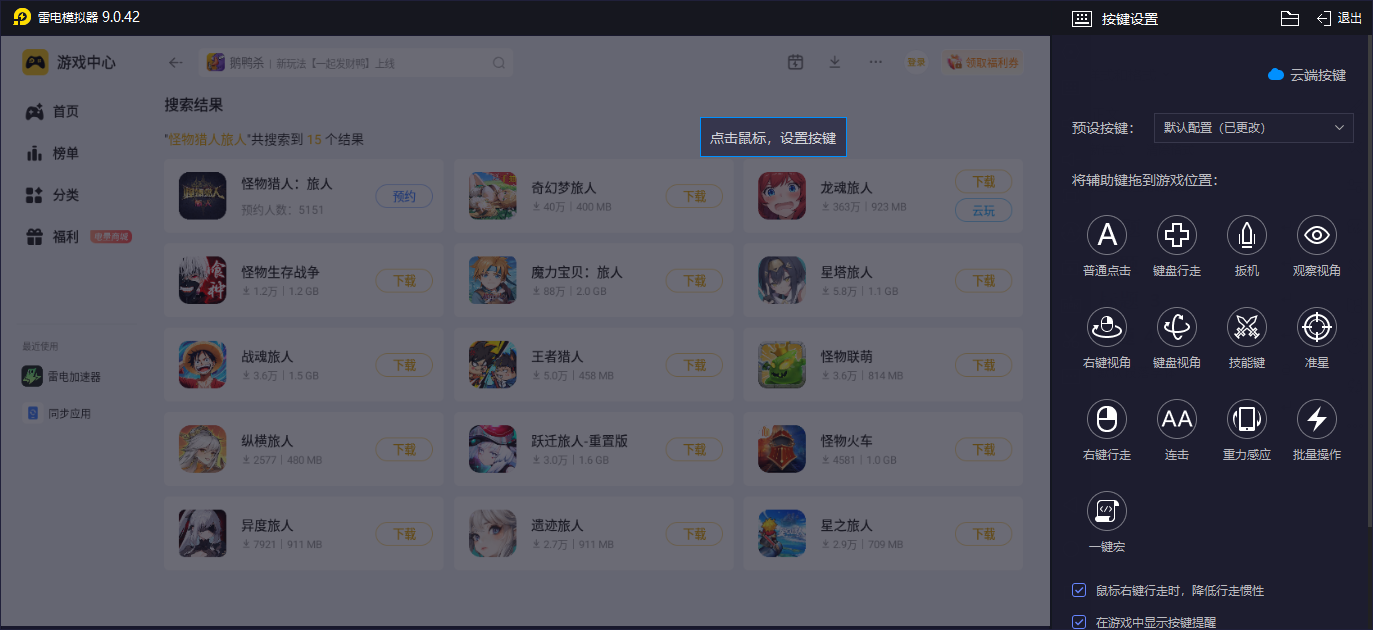 其实在战斗到时候,我们也是会有需要使用很多不同操作技巧以及技能的情况,而去使用雷电模拟器的话,大家就能去根据自身的喜好与习惯来设定不同的键位,对于常用的陷阱布置等就可直接绑定到数字键,也能通过wasd来进行移动的设定,包括在战斗中的一些道具快速切换与使用等,都是可以去设定的,让玩家的狩猎速度可以得到大幅度提升,战斗的精准度方面也更高,不用再担心会有失误的情况发生。