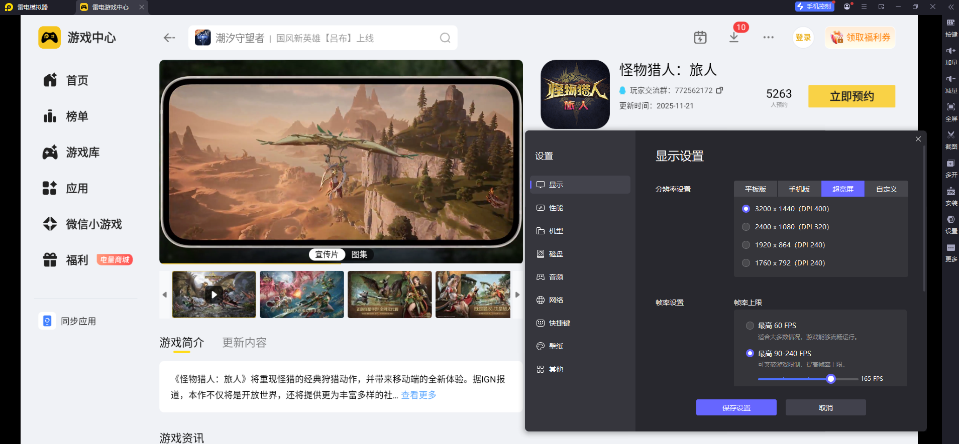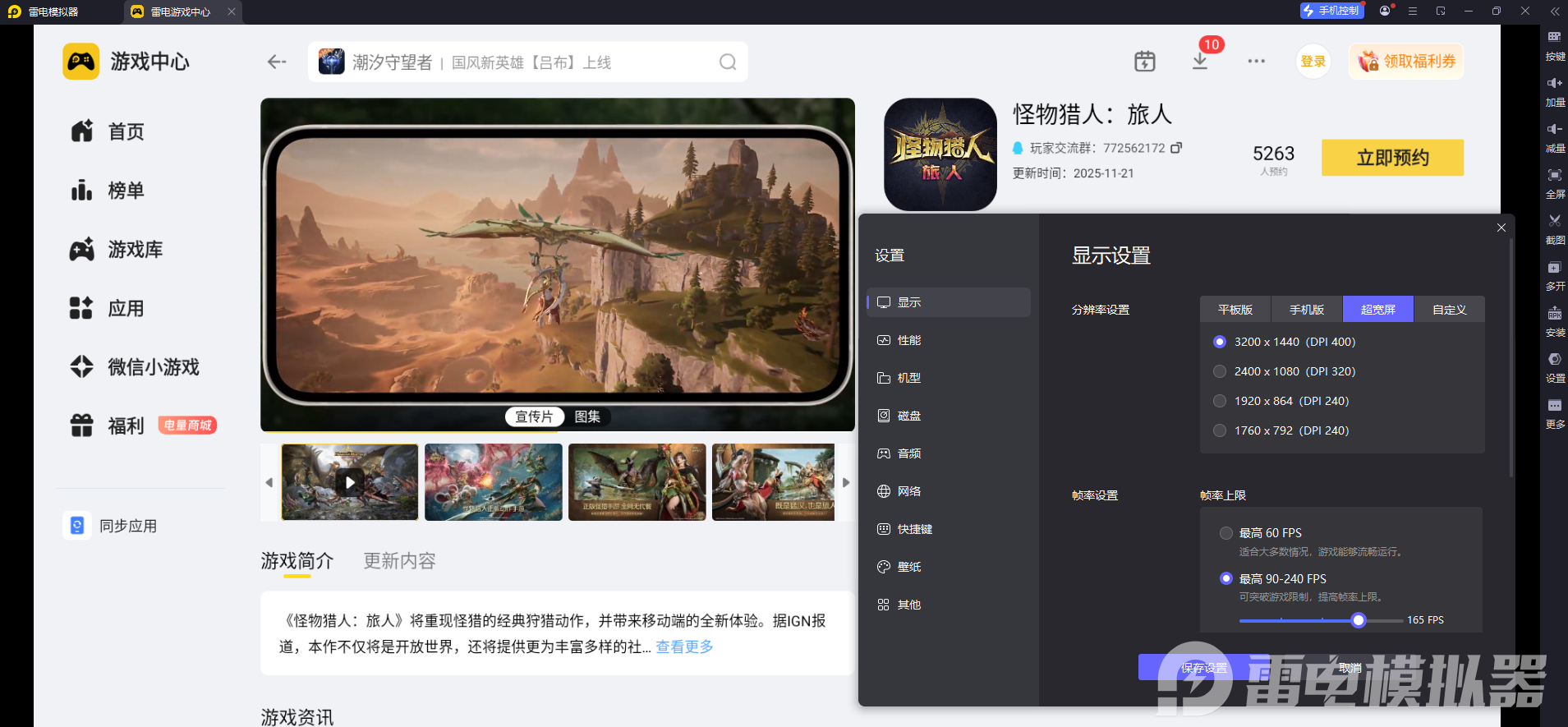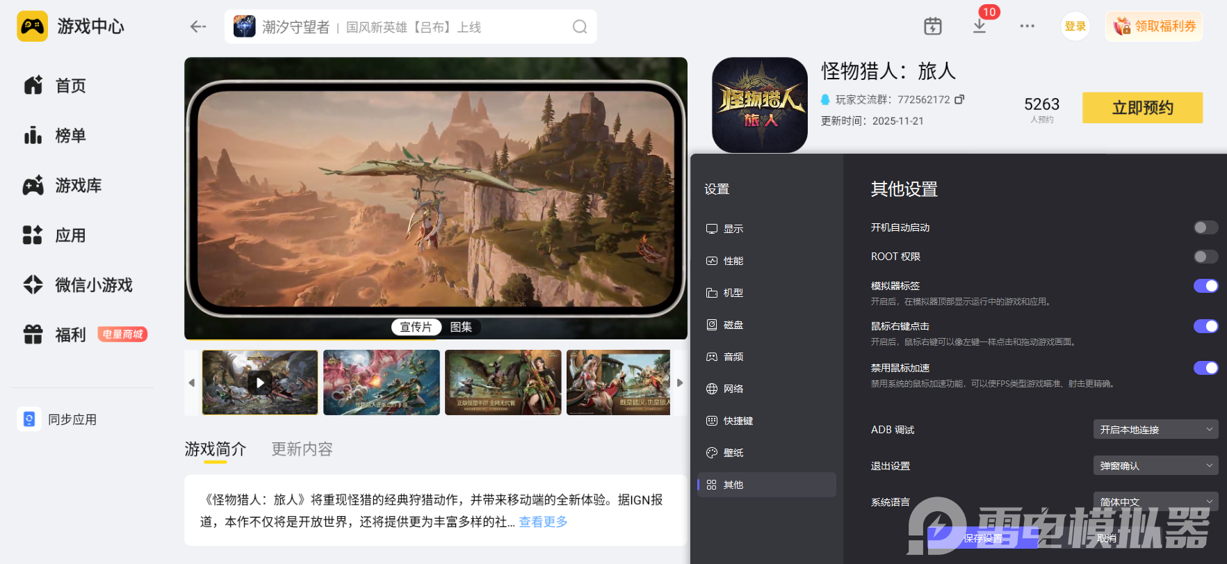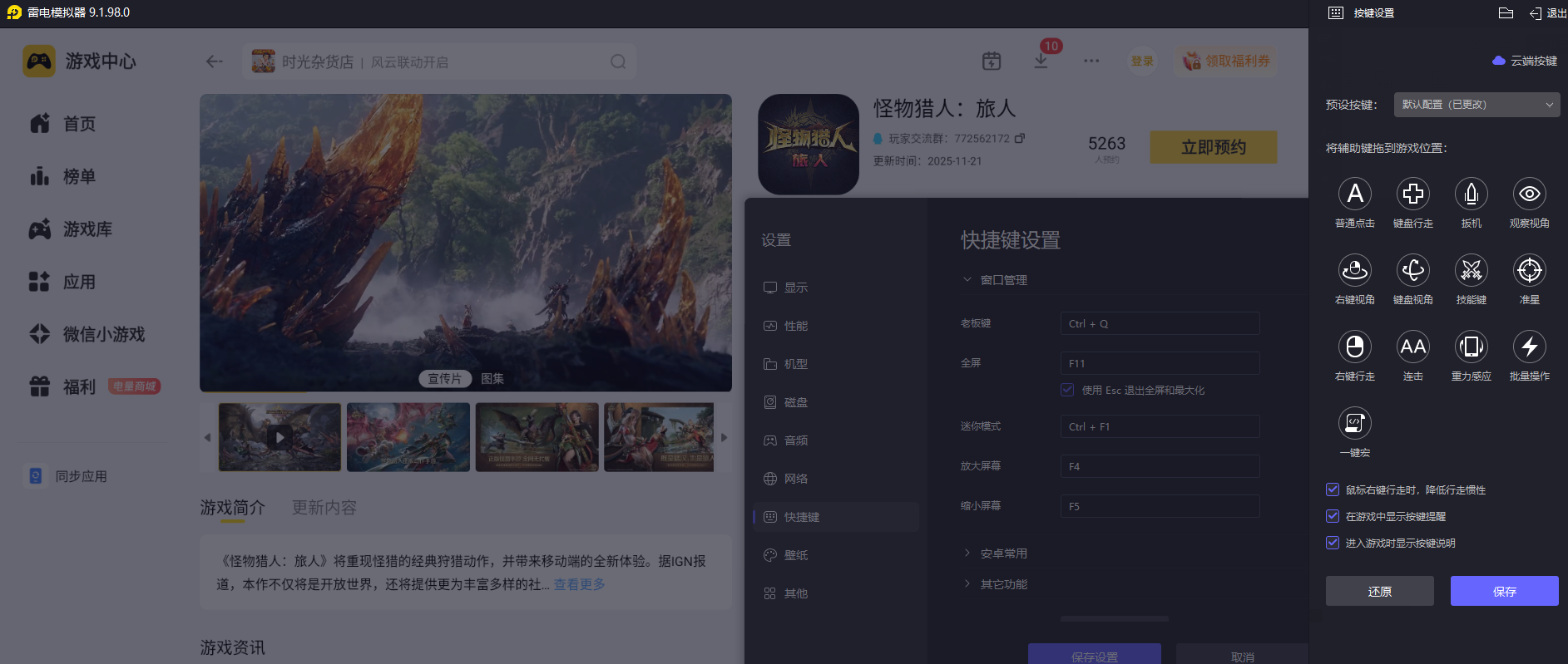 大剑连招需要清晰看清怪物的动作前摇和自身攻击判定范围,手机屏幕尺寸有限,很难完整呈现这些细节,经常会出现打空技能或者错过输出窗口的情况。雷电模拟器的4K大屏高清显示,能把怪物的攻击动作、技能判定圈完整展现出来,让每一段连招都能精准命中怪物弱点。