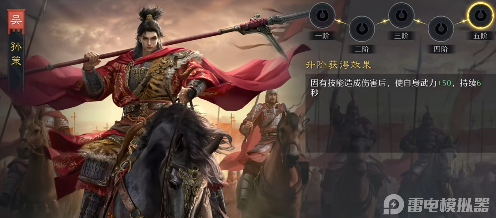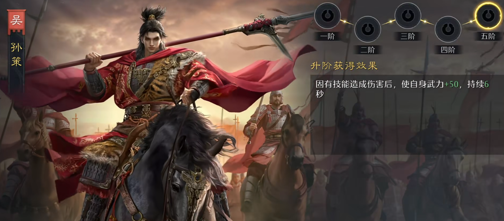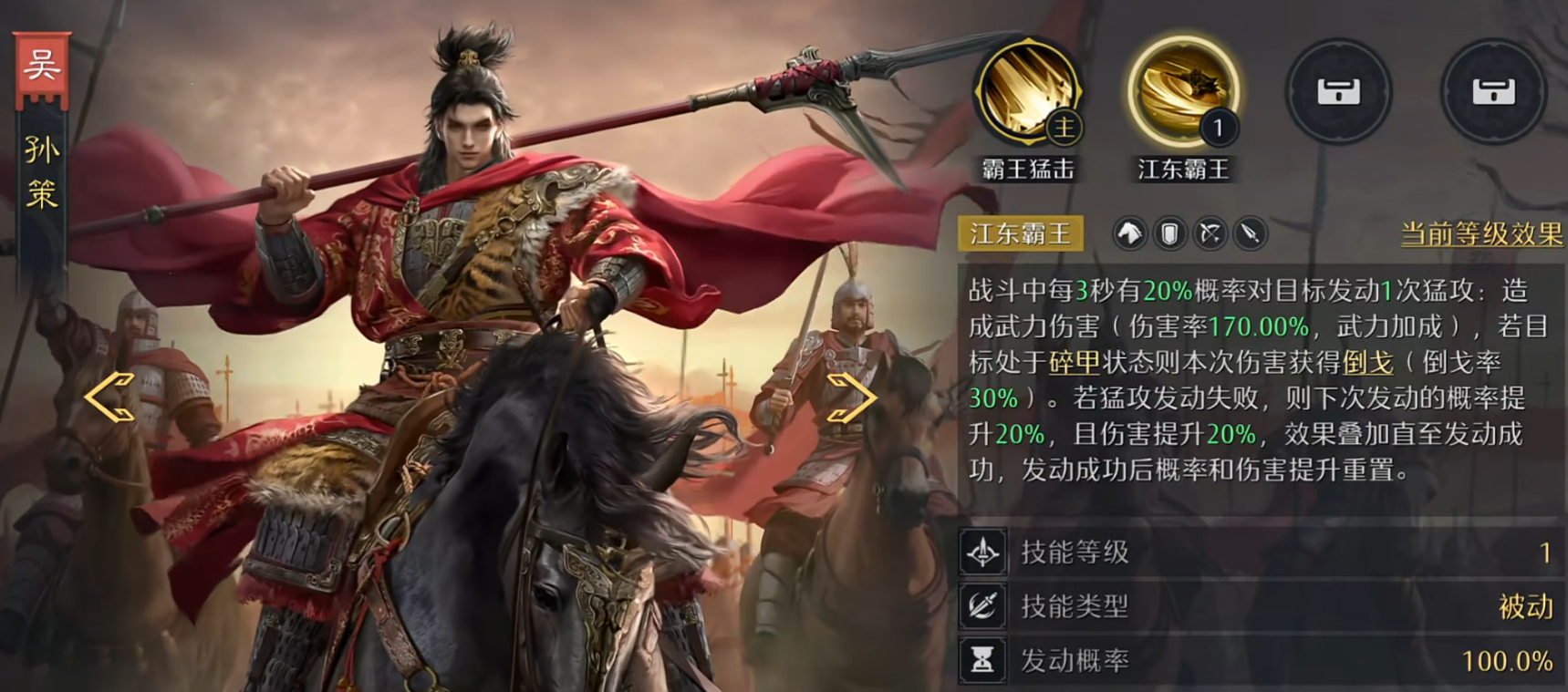 九牧之野的孙策定位是输出核心,有着双S高资质,攻击力和速度都很突出。他是前期活动免费赠送的武将,不用氪金就能入手,新手也能快速培养。战斗中,孙策每3秒就有一次额外输出机会,被动触发概率还能叠加,遇到溃散状态的敌人还能额外增伤50%。