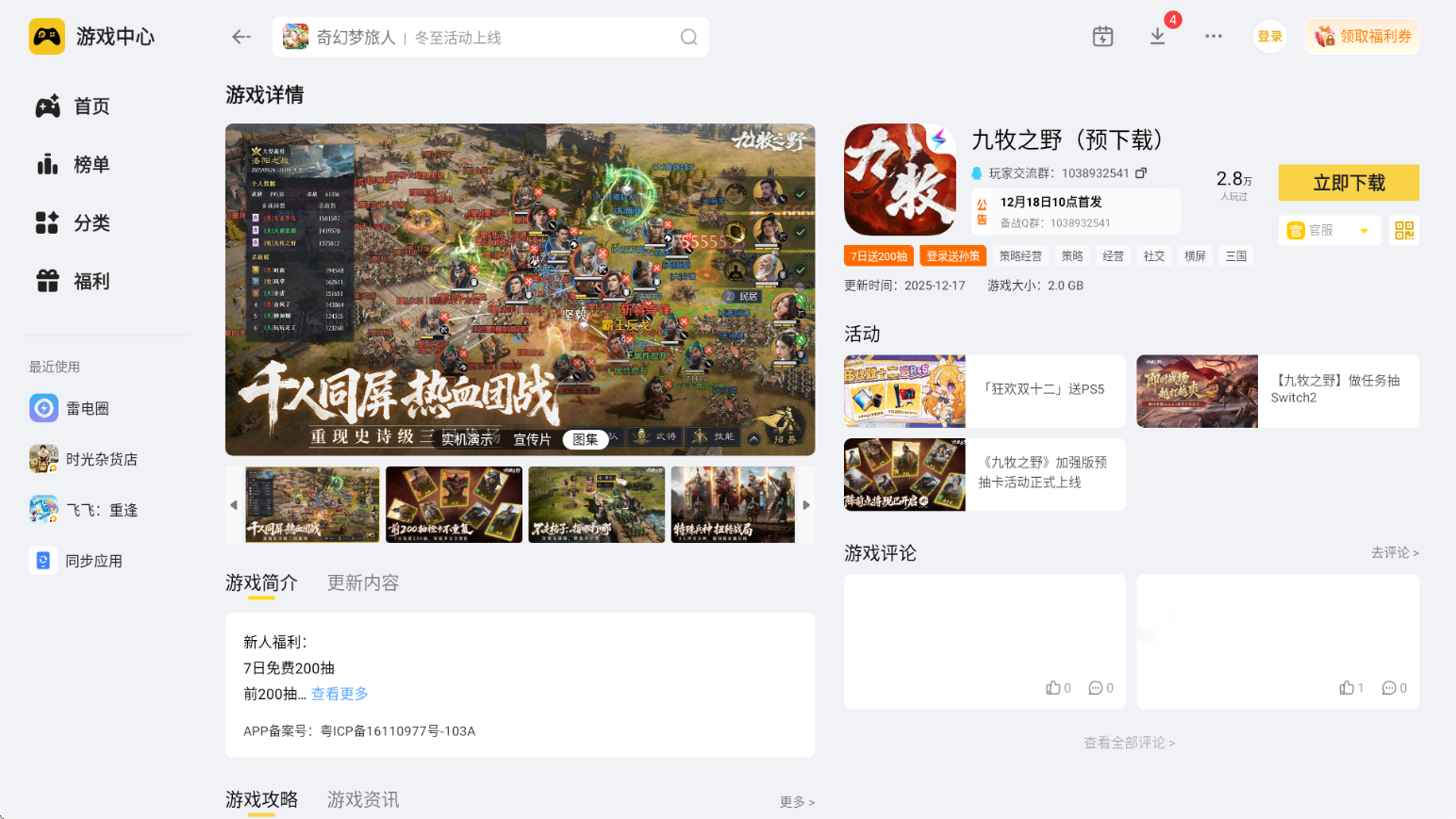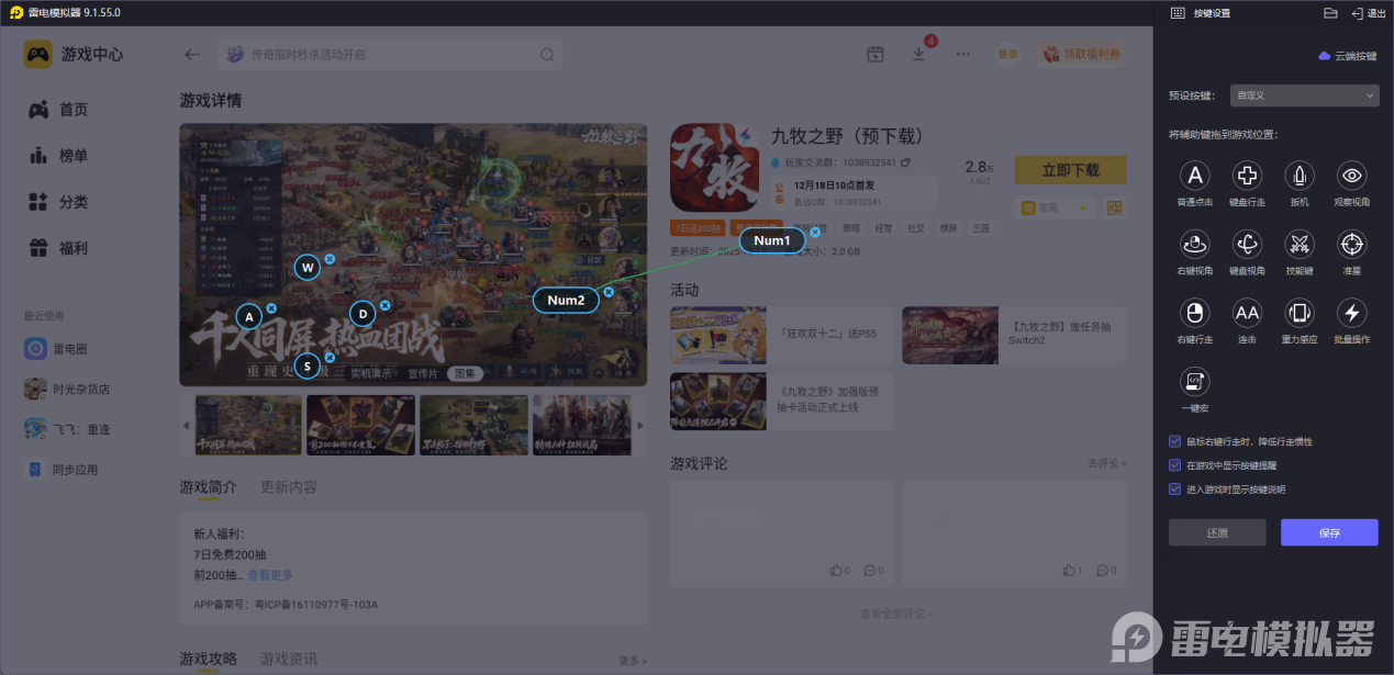 小编建议大家用雷电模拟器玩《九牧之野》,能让吕布配队的实战效果翻倍。首先键鼠操作更精准,吕布配队需要快速释放技能、调整站位,键鼠映射避免触屏误触,让“破军”技能精准命中多目标,怒气循环更流畅。