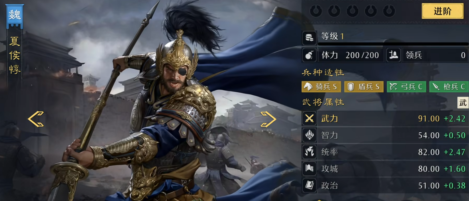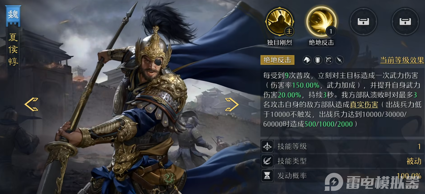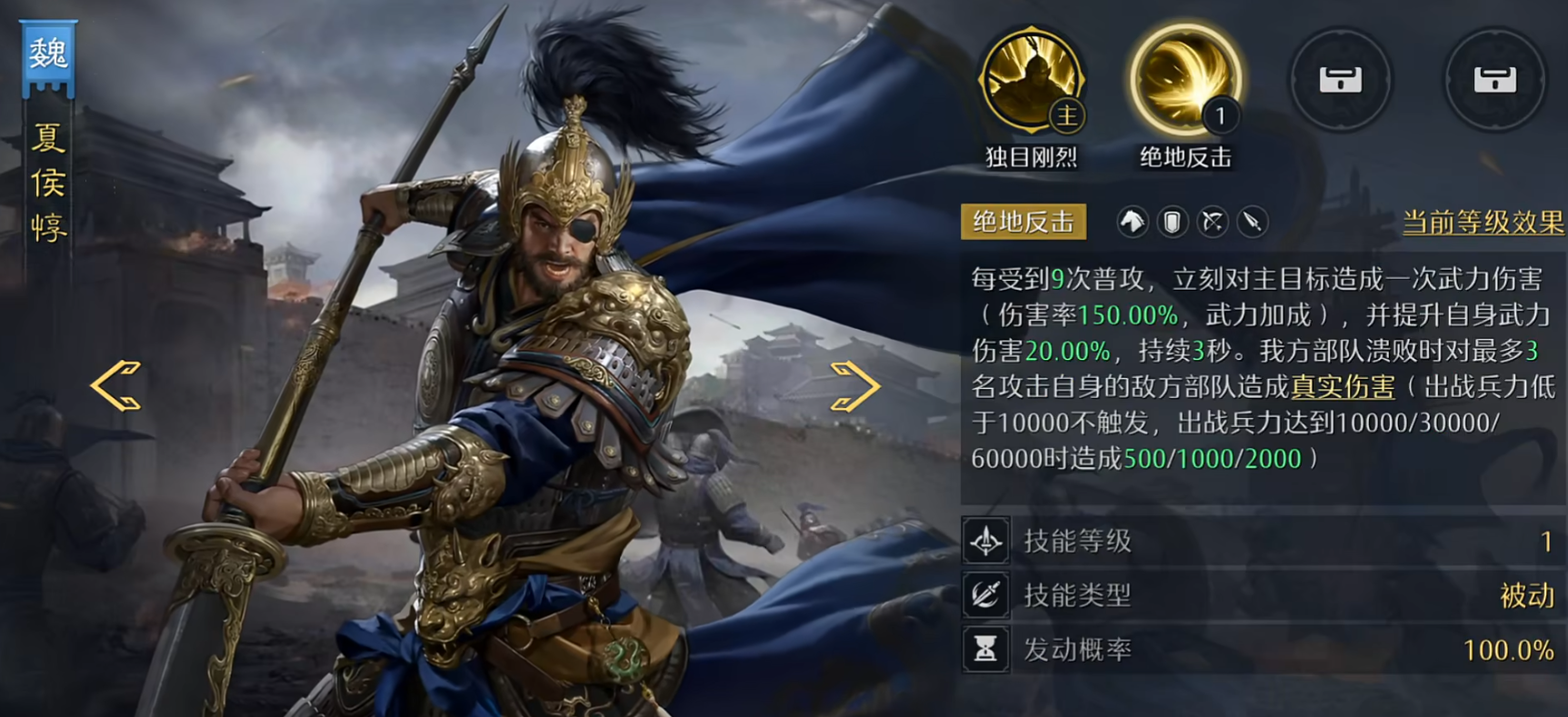 夏侯惇绝对是《九牧之野》里值得培养的强力武将,核心亮点就是独特的反击机制。他有25%的基础反击概率,完成四次普通攻击后就能触发多次反击,累计到九次普攻时,还能额外获得20%的物理增伤。