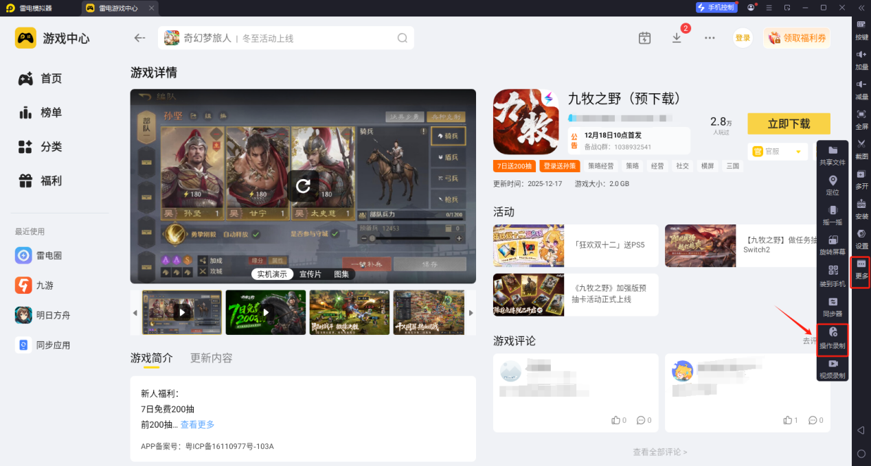 培养九牧之野预抽卡选到的武将,可以利用雷电模拟器的操作录制功能,帮助我们自动培养九牧之野开荒队伍,资源的获取更轻松。相比于手机的长时间挂机,模拟器可以稳定挂机,再也不用担心手机发烫等问题。