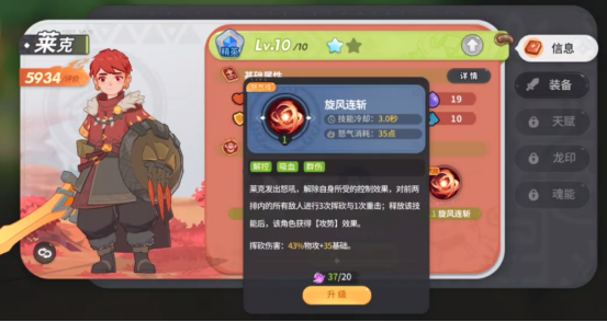 虽然我是一名战士,但我的输出能力同样不容小觑,这也多亏了我的怒气技旋风连斩,旋风连斩会消耗35点怒气,技能CD3.0秒,释放旋风连斩后,我会对敌方前两排内的所有敌人进行3次挥砍与1次重击,并且获得攻势效果,是性价比非常高的怒气技哦,在提供高额AOE伤害的同时,还能为我提升BUFF。