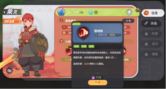 我在游戏的定位是一名战士,大家应该都已经猜到了吧,接下来我先给大家介绍一下我的技能吧,我的主技能是裂地斩,释放裂地斩后可以对敌方单体目标造成高额的物理伤害,并且击败敌人后可以重新释放一次,技能CD为1回合,这大幅增加了我的输出能力与收割能力,让我在战士位也能有不俗的伤害收割能力。