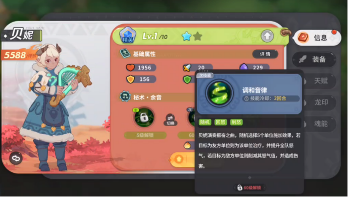 当我达到60级后,会解锁技能调和音律,这是我的另一个技能,有3回合CD,解锁并装备后,我会奏振奋之曲,随机选择5个单位施加效果,若目标为友方单位则为该单位治疗,并提升全队怒气,若目标为敌方单位则削减其怒气值,并造成伤害,战斗中,怒气值是非常重要的设定,虽然是随机目标,但在高难副本中,提升的上限非常高,建议团长在我60级之后,切换到调和音律进行作战哦。
