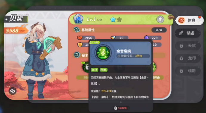 大家好呀,我是贝妮,我的定位是一位辅助角色,在战斗中我可以为伙伴们治疗、给大家提升增益、对敌人造成输出,是一个很全能的辅助,样样精通,首先,我的主技能是余音袅绕,有3回合CD,当我演奏鼓乐歌曲时,会为全体友军单位提供BUFF,根据我自身的法强提供物攻和其他能力,在前期对团队的提升相当巨大哦~