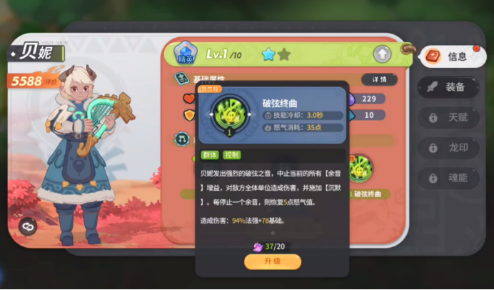 最后带大家看下我的怒气技,破弦终曲,我会发出强烈的破弦之音,中止当前的所有【余音】增益,对敌方全体单位造成伤害,并施加【沉默】。每停止一个余音,则恢复5点怒气值。造成伤害:,释放怒气技会消耗35点怒气,并有3.0秒的CD,这是我的核心技能,较短的CD及较少的怒气消耗,可以带来高额的收益,包含控制、伤害、怒气回复,释放合理的话可以轻松扭转战局,建议优先提升哦~
