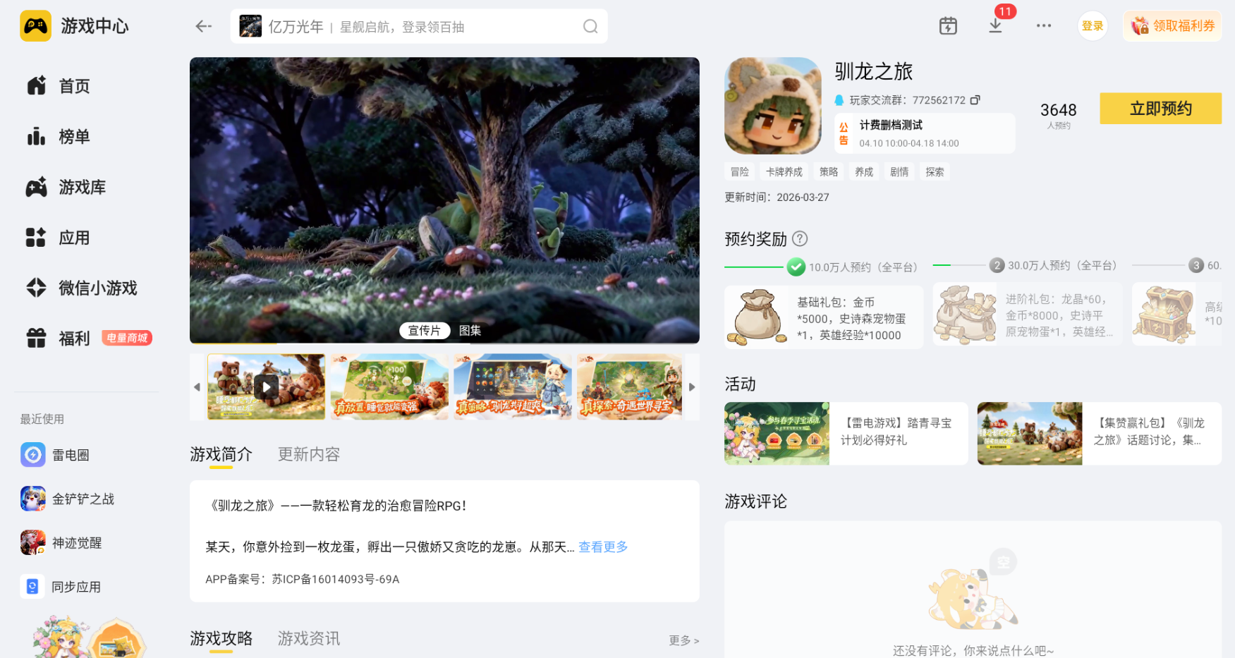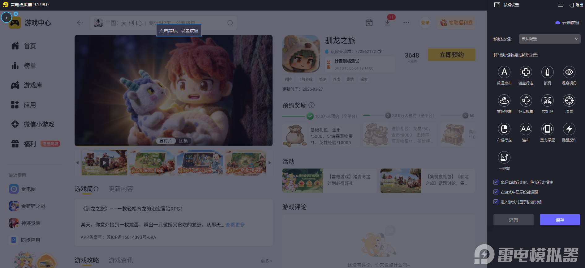 大家如果想要收获更优质的游玩体验,小编推荐使用雷电模拟器在电脑上体验驯龙之旅。大家可以直接前往雷电模拟器官网下载对应的安装包,完成安装流程后,在内置的雷电游戏中心找到驯龙之旅的预约入口,完成预约操作,静待游戏上线后就能在电脑端开启专属驯龙冒险。