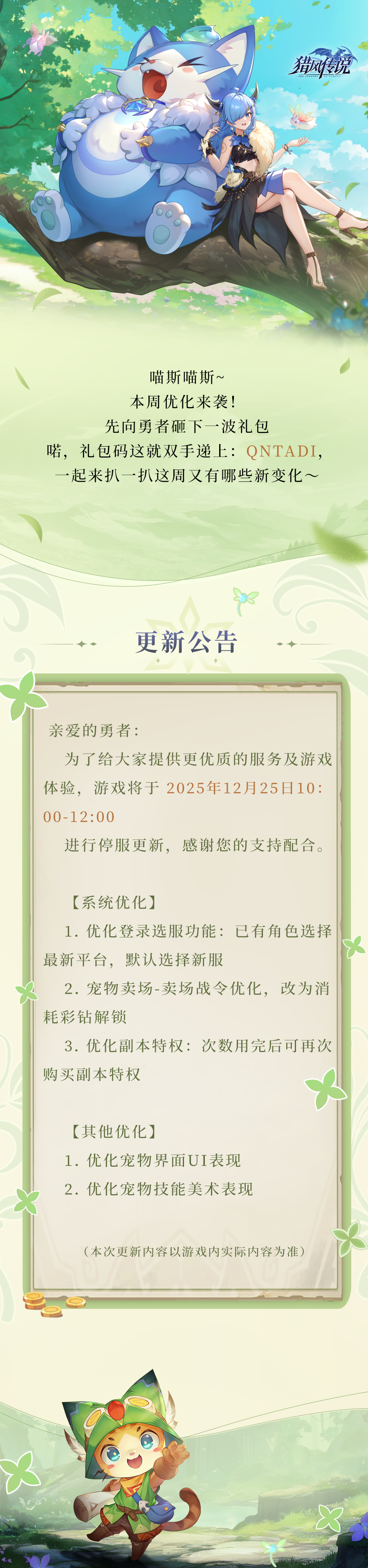 喵斯喵斯~本周优化来袭!先向勇者砸下一波礼包 喏,礼包码这就双手递上:QNTADI,一起来扒一扒这周又有哪些新变化~
