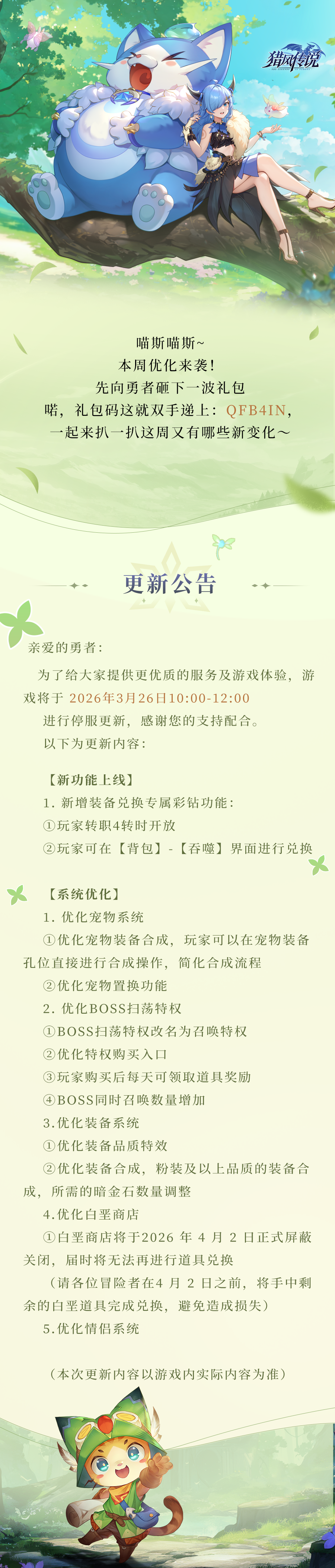 喵斯喵斯~本周优化来袭!先向勇者砸下一波礼包喏,礼包码这就双手递上:QFB4IN,一起来扒一扒这周又有哪些新变化~