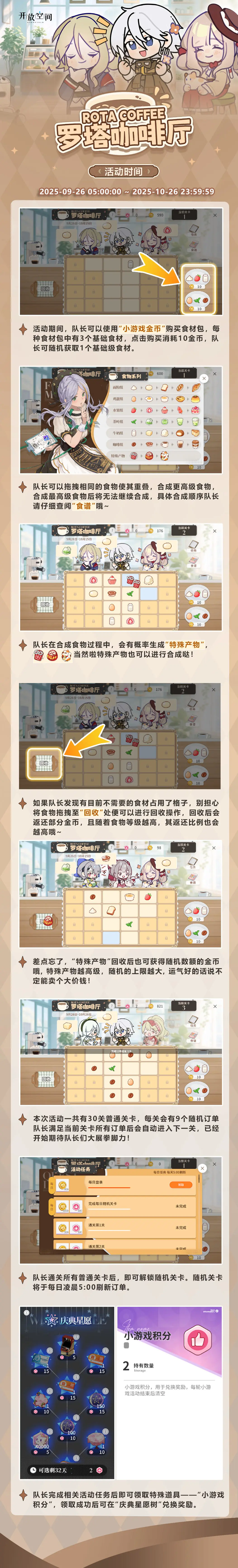 ✦活动时间✦9月26日版本更新后 - 10月26日 23:59✦活动说明✦醇香兑换浪漫,积分点亮星愿!在「罗塔咖啡厅」合成美味赢取积分,即可前往活动树【庆典星愿】兑换好礼!招募券、主题家具、丰富资源……等你带回家!详细活动玩法介绍请查看活动介绍长图~