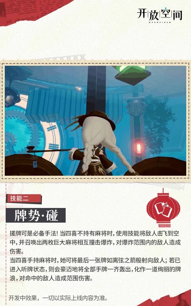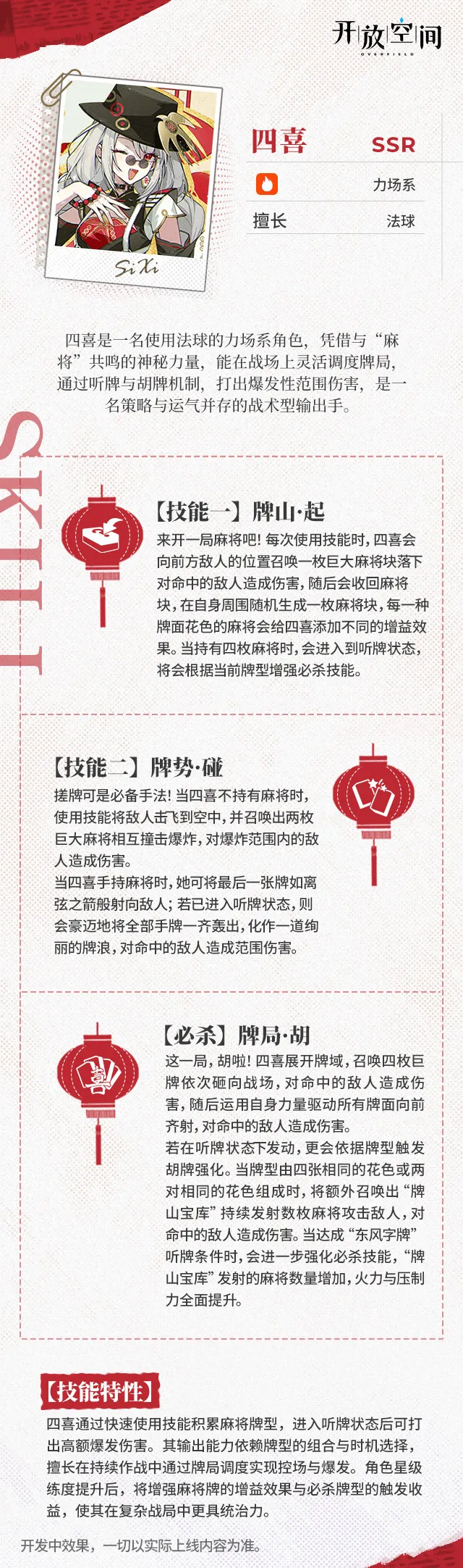 "你好啊,叫我四喜就行。改天要不一起打两局麻将,在麻将桌上认识认识,就认识了。"四喜是一名使用法球的力场系角色,凭借与“麻将”共鸣的神秘力量,能在战场上灵活调度牌局,通过听牌与胡牌机制,打出爆发性范围伤害,是一名策略与运气并存的战术型输出手。