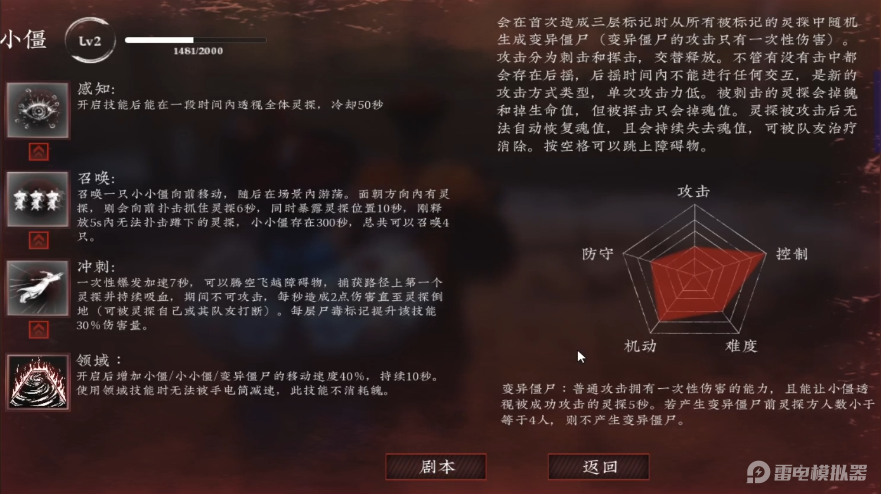小僵擅长召唤与控场,他能召唤“小小僵”扑击并禁锢灵探,其“血腥冲刺”更能直接吸取灵探血液直至其倒地,利用尸潮封锁地图通道,对魄值低的目标发动致命一击。