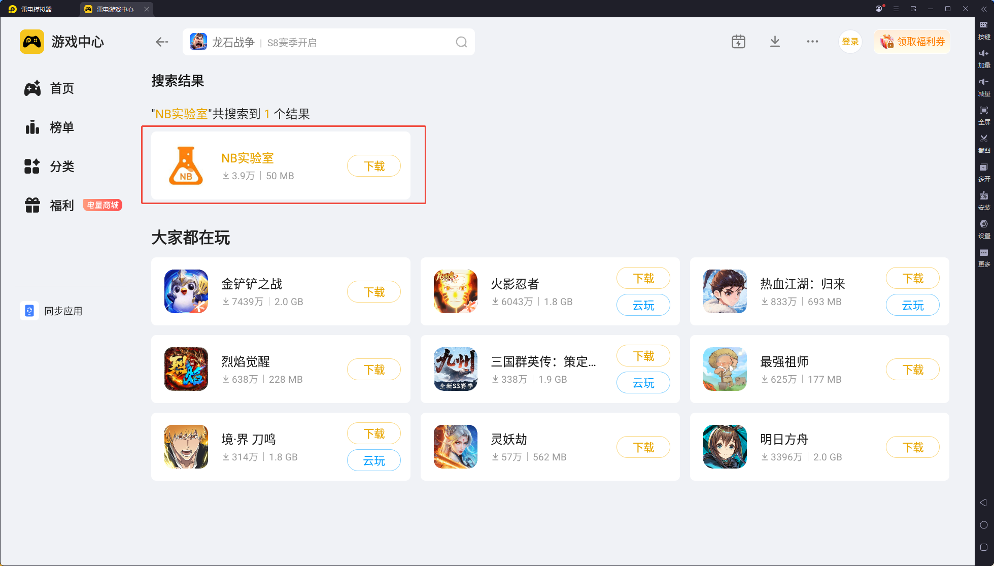 安装包下载完成后,双击运行进行安装,按照提示完成安装流程即可。安装完成并启动模拟器后,找到左侧的雷电游戏中心并点击,在搜索框中输入NB实验室,搜索完成后就能看到对应的下载按钮,直接点击安装,等待安装完成后,就可以在电脑上正常使用NB实验室进行虚拟实验操作了。