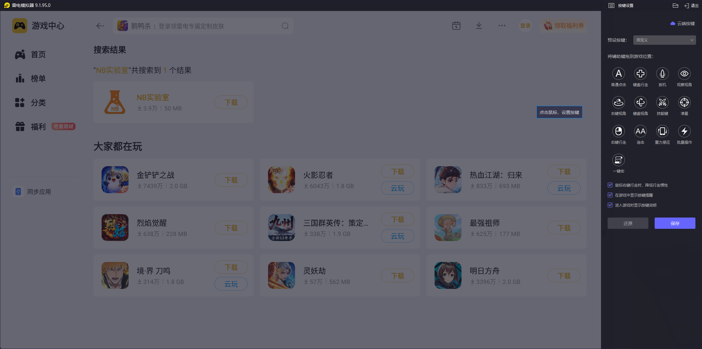 雷电模拟器支持超宽屏显示,使用NB实验室时能看清实验器材的细微结构和反应过程,避免UI遮挡关键画面。其键鼠操作精准流畅,不会出现手机端的误触问题,搭配为NB实验室适配的默认一键宏,可实现精准添加试剂、启动实验等操作,若不满意还能轻松自定义修改。