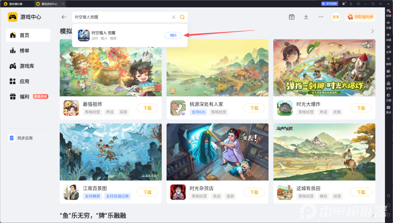 打开雷电模拟器后,进入内置游戏中心,在搜索栏输入“时空猎人觉醒”找到对应游戏页面。目前游戏处于预约阶段,点击预约按钮即可成功预约,上线后会自动提醒,届时一键下载安装,全程无需复杂设置,一键即可畅玩,大屏操作更流畅,让你沉浸式体验时空猎人觉醒的热血战斗。