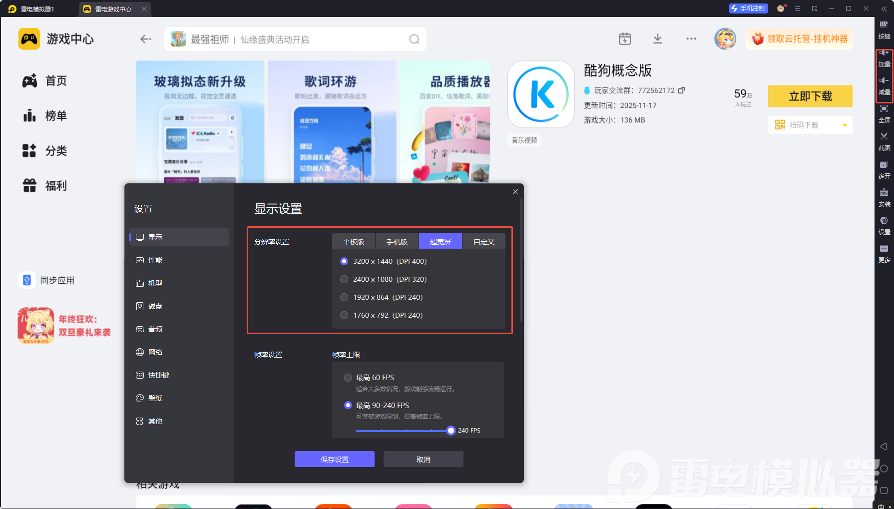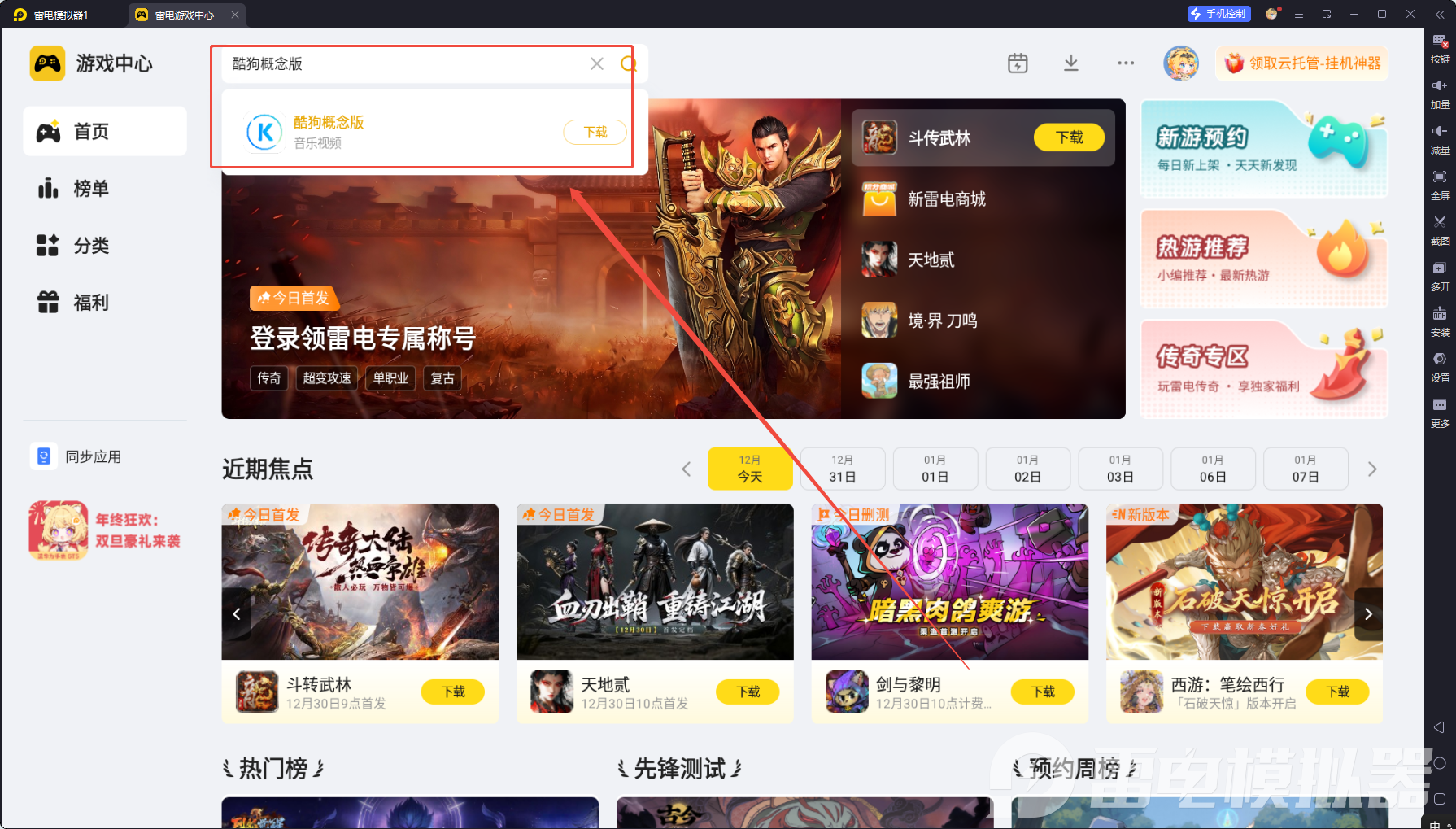 下载好雷电模拟器后,打开雷电模拟器内的“雷电游戏中心”,搜索“酷狗概念版”即可下载酷狗概念版电脑版。