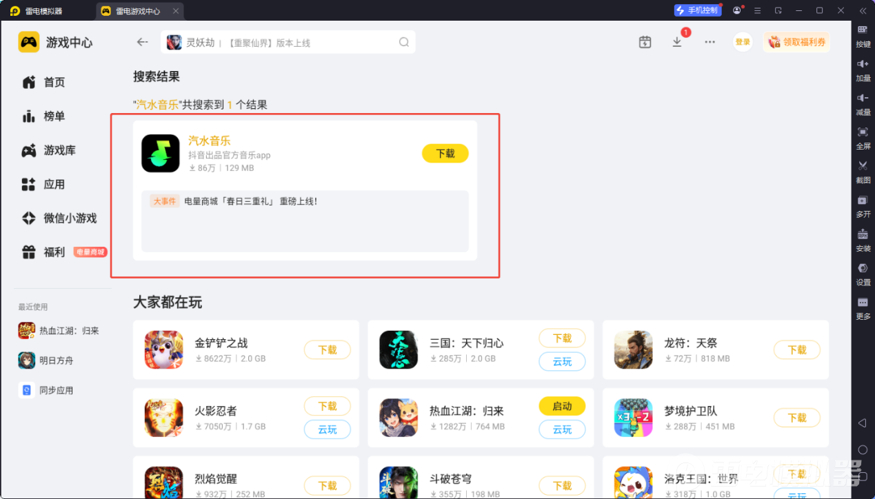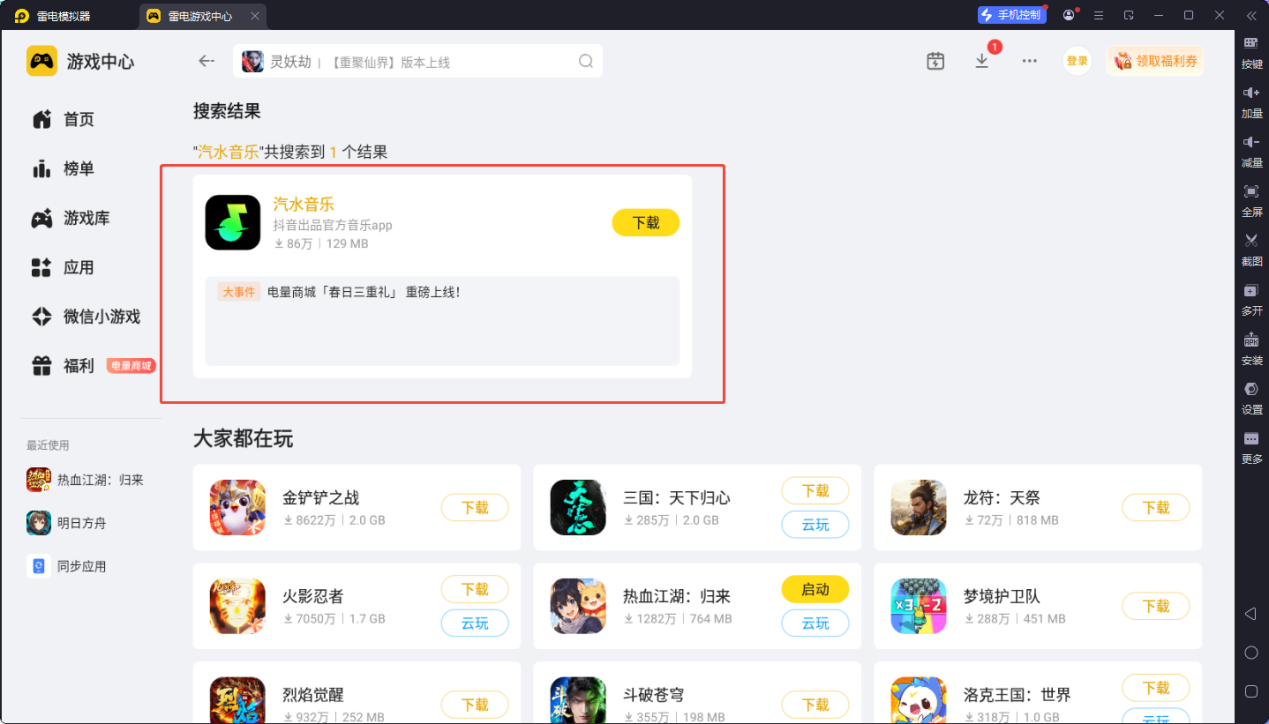 装机完毕直接启动雷电模拟器,点开内置专属应用中心,搜索关键词汽水音乐,一键点击自动下载安装,无需手动额外调试参数,安装完成点击图标,登录账号就能直接解锁汽水音乐全部听歌专属功能。