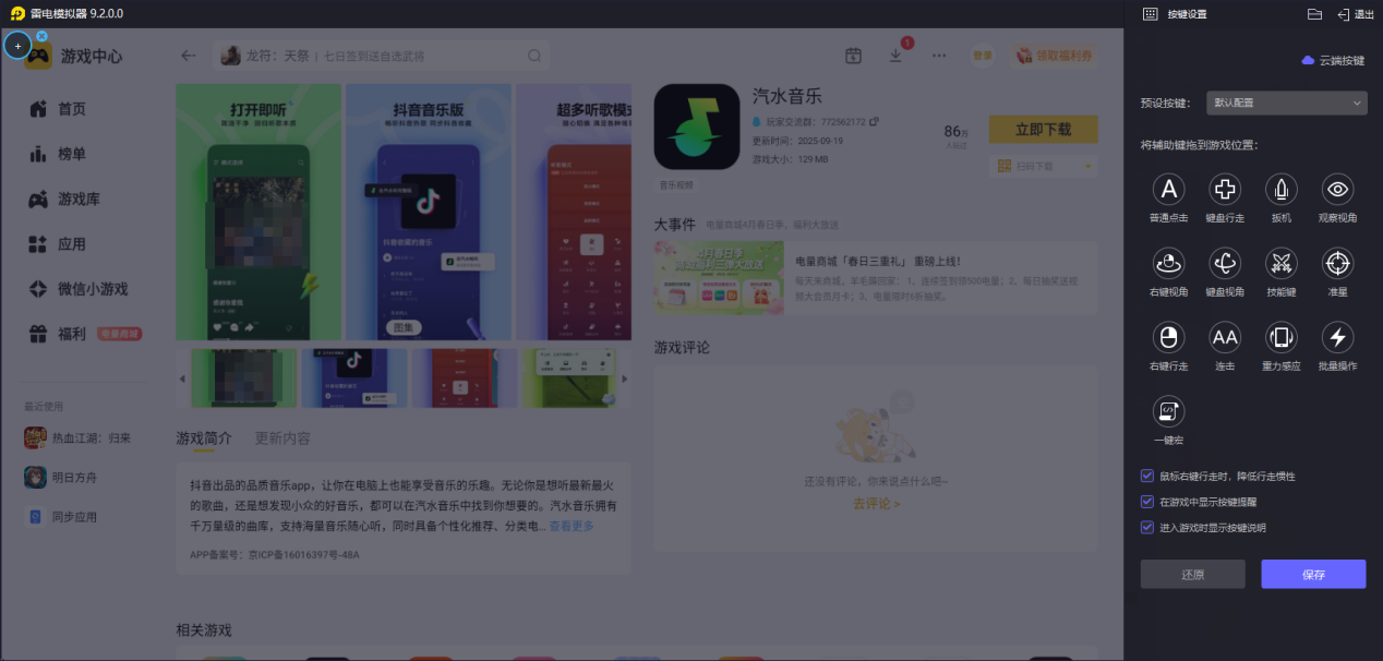 雷电模拟器贴合电脑大屏专属适配调校,完美适配汽水音乐高清歌词界面、音乐榜单封面全屏展示,视野开阔护眼不费眼,告别手机小屏盯看疲劳。