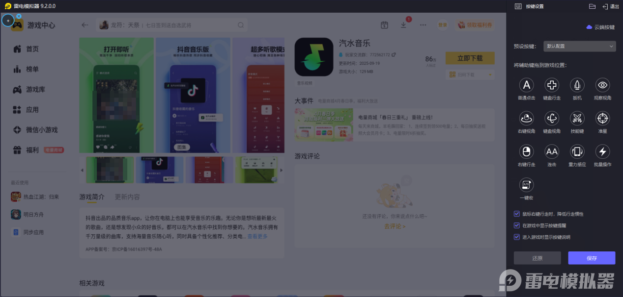 想要大屏无损畅听金曲、安稳常驻后台放歌,直接用雷电模拟器下载汽水音乐电脑版,轻松解锁电脑端沉浸式高品质听歌体验。