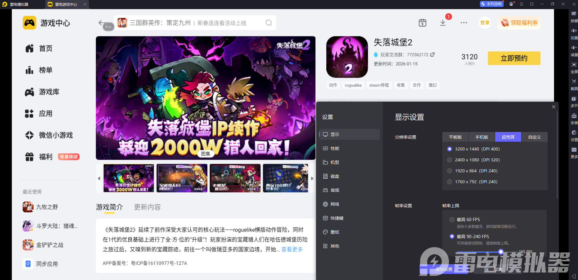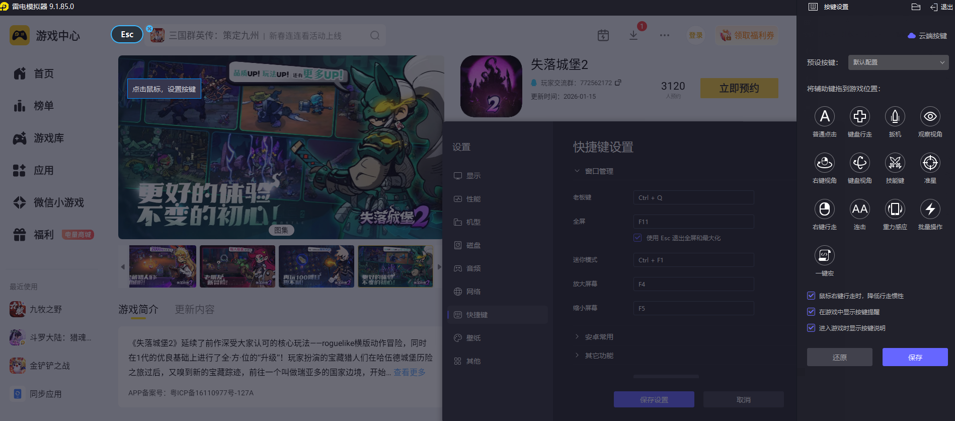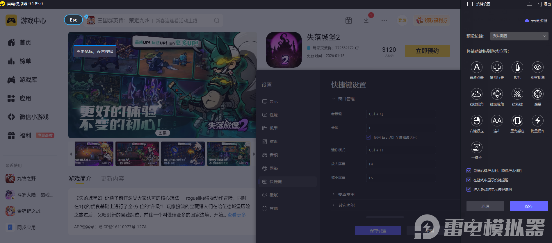 《失落城堡2》的战斗需要频繁走位、快速释放技能,还要流畅衔接连招,手机触屏操作时,手指容易遮挡屏幕,按键精准度也不够,很难打出顺畅的操作。雷电模拟器支持自定义键盘与鼠标按键,能把移动、攻击、技能等操作绑定到顺手的键位,角色走位更灵活,技能释放更及时,连招衔接更自然,面对成群怪物时也能从容应对。