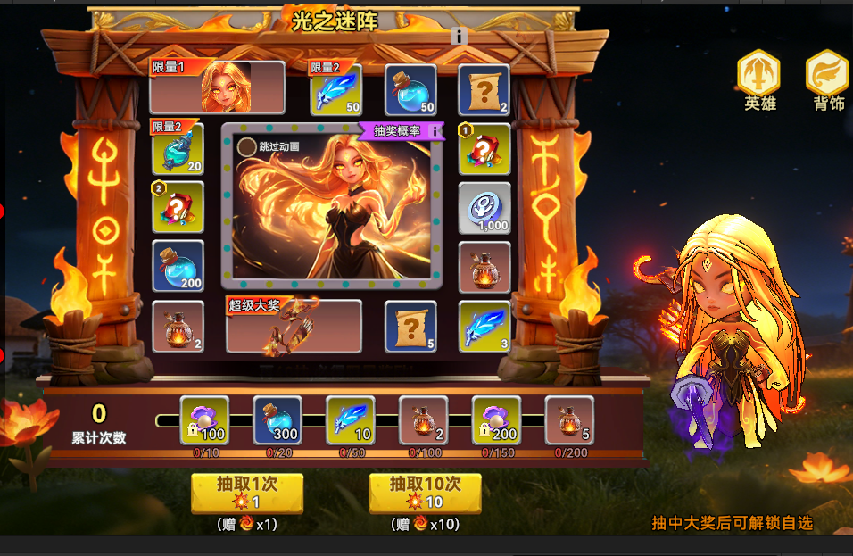1、玩家消耗火光抽取奖池中的奖励,并额外赠送丰火