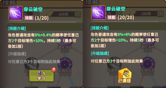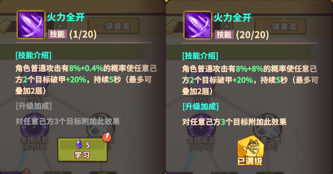 1级时角色普通攻击有8%+0.4%概率使任意己方2个目标破甲+20%,持续5秒(最多可叠加2层),10级解锁对任意己方3个目标附加此效果的附加效果,随着升级每级触发的概率增加0.4%,满级技能有8%+8%概率使任意己方3个目标破甲+20%