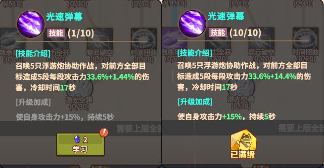 1级召唤5只浮游炮协助作战,对前方全体目标造成5段每段攻击力33.6%+1.44%的伤害,5级解锁使自身攻击力+15%,持续5秒的附加效果,随着升级每级造成的每段伤害多增加1.44%,满级技能造成5段每段攻击力33.6%+14.4%的伤害,全等级的冷却时间皆为17秒